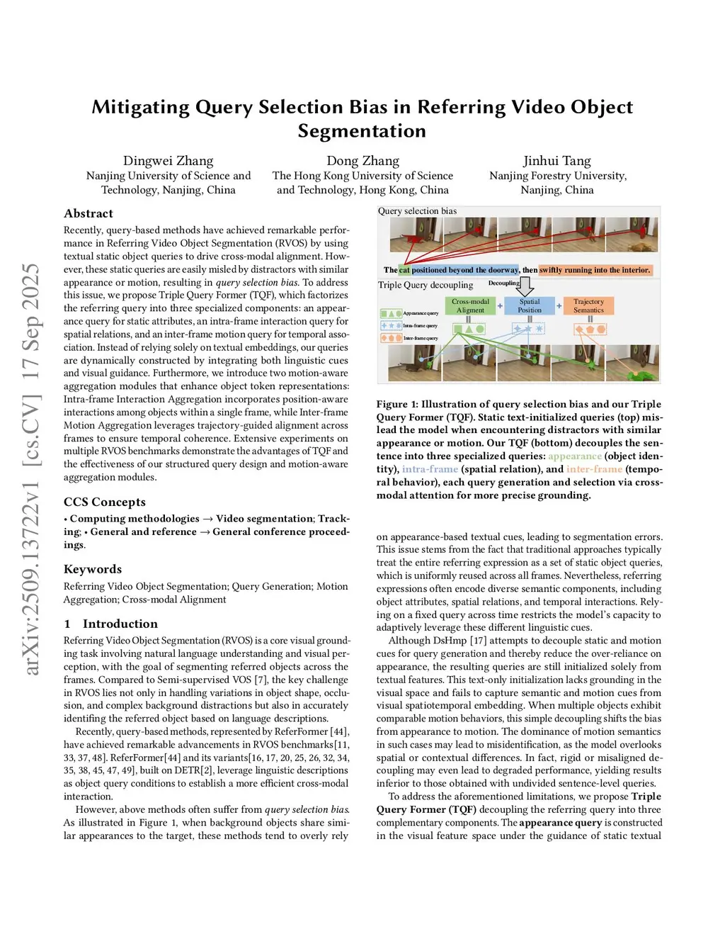 Recently, query-based methods have achieved remarkable performance in Referring Video Object Segmentation (RVOS) by using textual static object queries to drive cross-modal alignment. However, these static queries are easily misled by distractors with similar appearance or motion, resulting in \emph{query selection bias}. To address this issue, we propose Triple Query Former (TQF), which factorizes the referring query into three specialized components: an appearance query for static attributes, an intra-frame interaction query for spatial relations, and an inter-frame motion query for temporal association. Instead of relying solely on textual embeddings, our queries are dynamically constructed by integrating both linguistic cues and visual guidance. Furthermore, we introduce two motion-aware aggregation modules that enhance object token representations: Intra-frame Interaction Aggregation incorporates position-aware interactions among objects within a single frame, while Inter-frame Motion Aggregation leverages trajectory-guided alignment across frames to ensure temporal coherence. Extensive experiments on multiple RVOS benchmarks demonstrate the advantages of TQF and the effectiveness of our structured query design and motion-aware aggregation modules.