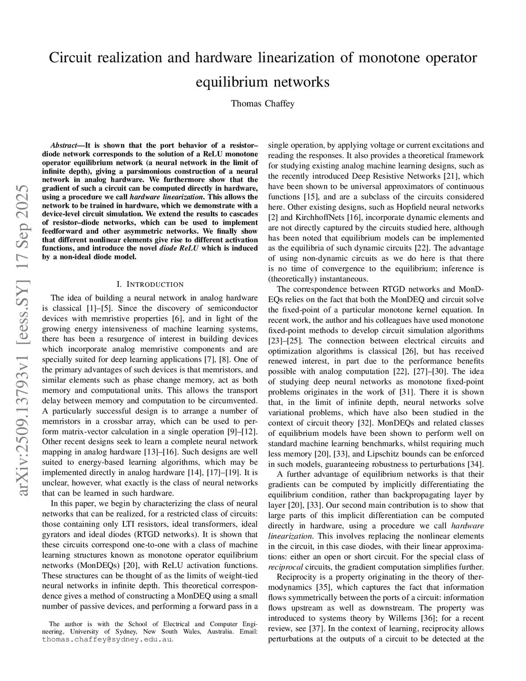 It is shown that the port behavior of a resistor- diode network corresponds to the solution of a ReLU monotone operator equilibrium network (a neural network in the limit of infinite depth), giving a parsimonious construction of a neural network in analog hardware. We furthermore show that the gradient of such a circuit can be computed directly in hardware, using a procedure we call hardware linearization. This allows the network to be trained in hardware, which we demonstrate with a device-level circuit simulation. We extend the results to cascades of resistor-diode networks, which can be used to implement feedforward and other asymmetric networks. We finally show that different nonlinear elements give rise to different activation functions, and introduce the novel diode ReLU which is induced by a non-ideal diode model.