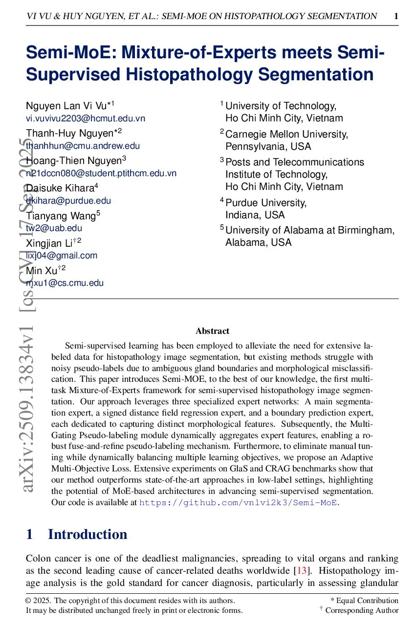 Semi-supervised learning has been employed to alleviate the need for extensive labeled data for histopathology image segmentation, but existing methods struggle with noisy pseudo-labels due to ambiguous gland boundaries and morphological misclassification. This paper introduces Semi-MOE, to the best of our knowledge, the first multi-task Mixture-of-Experts framework for semi-supervised histopathology image segmentation. Our approach leverages three specialized expert networks: A main segmentation expert, a signed distance field regression expert, and a boundary prediction expert, each dedicated to capturing distinct morphological features. Subsequently, the Multi-Gating Pseudo-labeling module dynamically aggregates expert features, enabling a robust fuse-and-refine pseudo-labeling mechanism. Furthermore, to eliminate manual tuning while dynamically balancing multiple learning objectives, we propose an Adaptive Multi-Objective Loss. Extensive experiments on GlaS and CRAG benchmarks show that our method outperforms state-of-the-art approaches in low-label settings, highlighting the potential of MoE-based architectures in advancing semi-supervised segmentation. Our code is available atthis https URL.