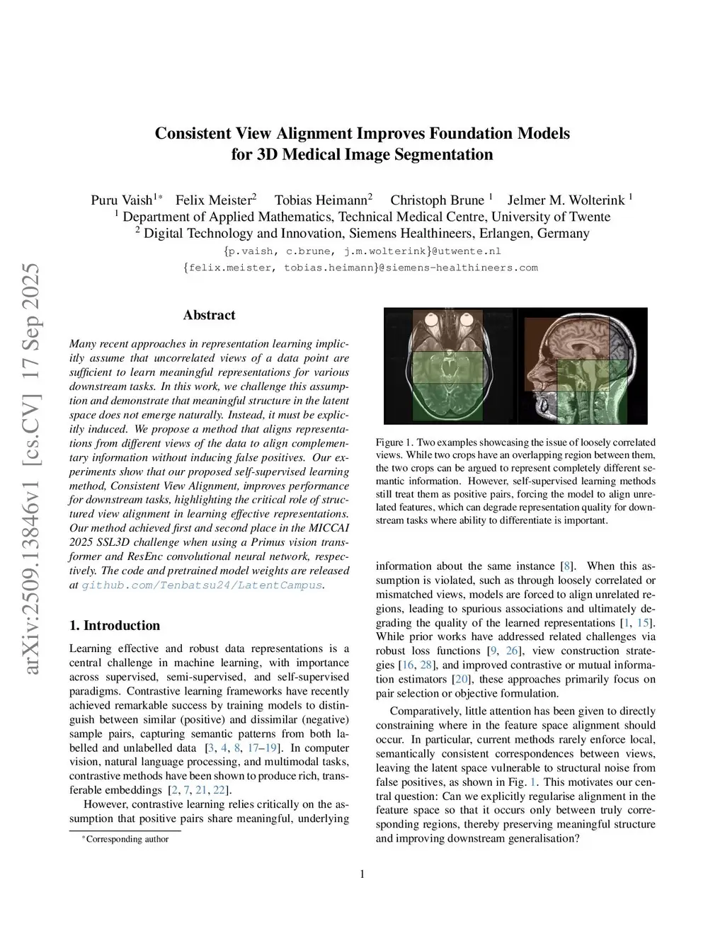 Many recent approaches in representation learning implicitly assume that uncorrelated views of a data point are sufficient to learn meaningful representations for various downstream tasks. In this work, we challenge this assumption and demonstrate that meaningful structure in the latent space does not emerge naturally. Instead, it must be explicitly induced. We propose a method that aligns representations from different views of the data to align complementary information without inducing false positives. Our experiments show that our proposed self-supervised learning method, Consistent View Alignment, improves performance for downstream tasks, highlighting the critical role of structured view alignment in learning effective representations. Our method achieved first and second place in the MICCAI 2025 SSL3D challenge when using a Primus vision transformer and ResEnc convolutional neural network, respectively. The code and pretrained model weights are released atthis https URL.