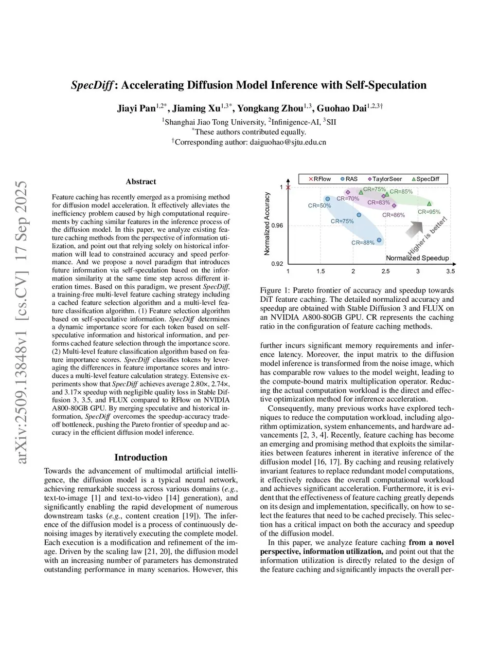 Feature caching has recently emerged as a promising method for diffusion model acceleration. It effectively alleviates the inefficiency problem caused by high computational requirements by caching similar features in the inference process of the diffusion model. In this paper, we analyze existing feature caching methods from the perspective of information utilization, and point out that relying solely on historical information will lead to constrained accuracy and speed performance. And we propose a novel paradigm that introduces future information via self-speculation based on the information similarity at the same time step across different iteration times. Based on this paradigm, we present \textit{SpecDiff}, a training-free multi-level feature caching strategy including a cached feature selection algorithm and a multi-level feature classification algorithm. (1) Feature selection algorithm based on self-speculative information. \textit{SpecDiff} determines a dynamic importance score for each token based on self-speculative information and historical information, and performs cached feature selection through the importance score. (2) Multi-level feature classification algorithm based on feature importance scores. \textit{SpecDiff} classifies tokens by leveraging the differences in feature importance scores and introduces a multi-level feature calculation strategy. Extensive experiments show that \textit{SpecDiff} achieves average 2.80 \times, 2.74 \times , and 3.17\times speedup with negligible quality loss in Stable Diffusion 3, 3.5, and FLUX compared to RFlow on NVIDIA A800-80GB GPU. By merging speculative and historical information, \textit{SpecDiff} overcomes the speedup-accuracy trade-off bottleneck, pushing the Pareto frontier of speedup and accuracy in the efficient diffusion model inference.