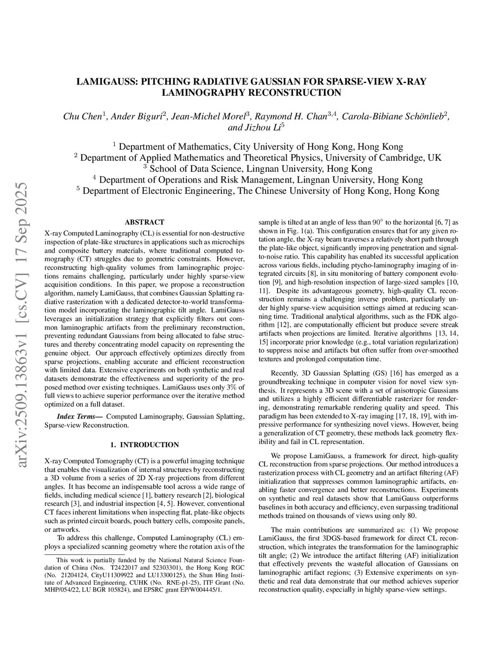 X-ray Computed Laminography (CL) is essential for non-destructive inspection of plate-like structures in applications such as microchips and composite battery materials, where traditional computed tomography (CT) struggles due to geometric constraints. However, reconstructing high-quality volumes from laminographic projections remains challenging, particularly under highly sparse-view acquisition conditions. In this paper, we propose a reconstruction algorithm, namely LamiGauss, that combines Gaussian Splatting radiative rasterization with a dedicated detector-to-world transformation model incorporating the laminographic tilt angle. LamiGauss leverages an initialization strategy that explicitly filters out common laminographic artifacts from the preliminary reconstruction, preventing redundant Gaussians from being allocated to false structures and thereby concentrating model capacity on representing the genuine object. Our approach effectively optimizes directly from sparse projections, enabling accurate and efficient reconstruction with limited data. Extensive experiments on both synthetic and real datasets demonstrate the effectiveness and superiority of the proposed method over existing techniques. LamiGauss uses only 3 of full views to achieve superior performance over the iterative method optimized on a full dataset.