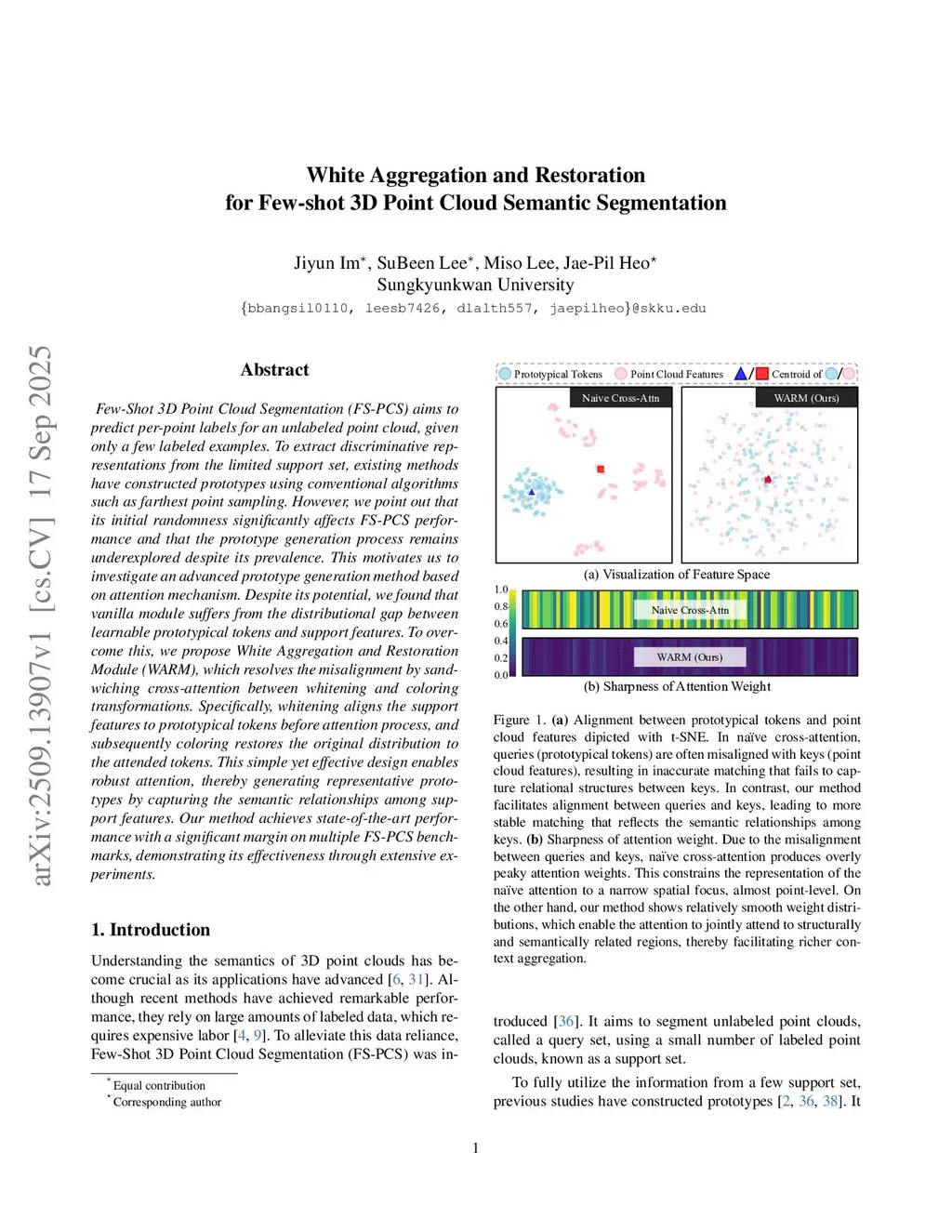 Few-Shot 3D Point Cloud Semantic Segmentation (FS-PCS) aims to predict per-point labels for an unlabeled point cloud, given only a few labeled examples. To extract discriminative representations from the limited labeled set, existing methods have constructed prototypes using algorithms such as farthest point sampling (FPS). However, we point out that this convention has undesirable effects as performance fluctuates depending on sampling, while the prototype generation process remains underexplored in the field. This motivates us to investigate an advanced prototype generation method based on attention mechanism. Despite its potential, we found that vanilla attention module suffers from the distributional gap between prototypical tokens and support features. To overcome this, we propose White Aggregation and Restoration Module (WARM), which resolves the misalignment by sandwiching cross-attention between whitening and coloring transformations. Specifically, whitening aligns the features to tokens before the attention process, and coloring subsequently restores the original distribution to the attended tokens. This simple yet effective design enables robust attention, thereby generating prototypes that capture the semantic relationships in support features. WARM achieves state-of-the-art performance with a significant margin on FS-PCS benchmarks, and demonstrates its effectiveness through extensive experiments.
