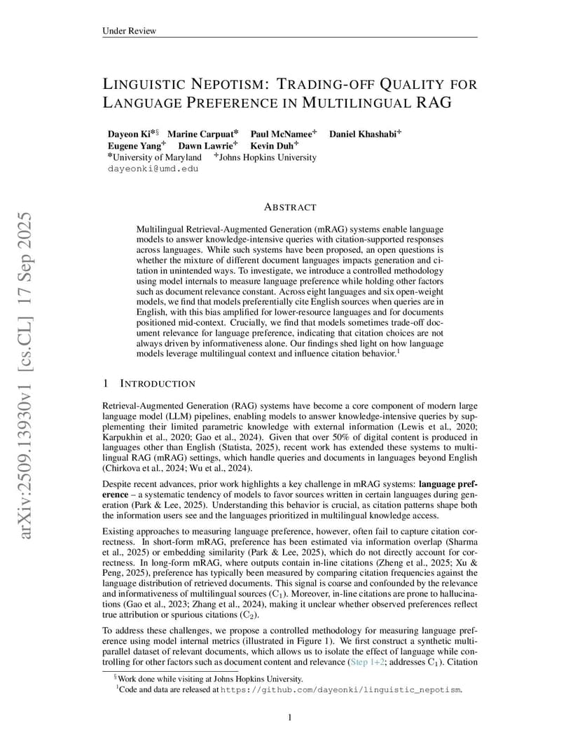 Multilingual Retrieval-Augmented Generation (mRAG) systems enable language models to answer knowledge-intensive queries with citation-supported responses across languages. While such systems have been proposed, an open questions is whether the mixture of different document languages impacts generation and citation in unintended ways. To investigate, we introduce a controlled methodology using model internals to measure language preference while holding other factors such as document relevance constant. Across eight languages and six open-weight models, we find that models preferentially cite English sources when queries are in English, with this bias amplified for lower-resource languages and for documents positioned mid-context. Crucially, we find that models sometimes trade-off document relevance for language preference, indicating that citation choices are not always driven by informativeness alone. Our findings shed light on how language models leverage multilingual context and influence citation behavior.