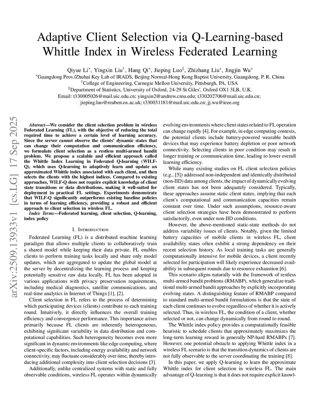 Adaptive Client Selection via Q-Learning-based Whittle Index in Wireless Federated Learning