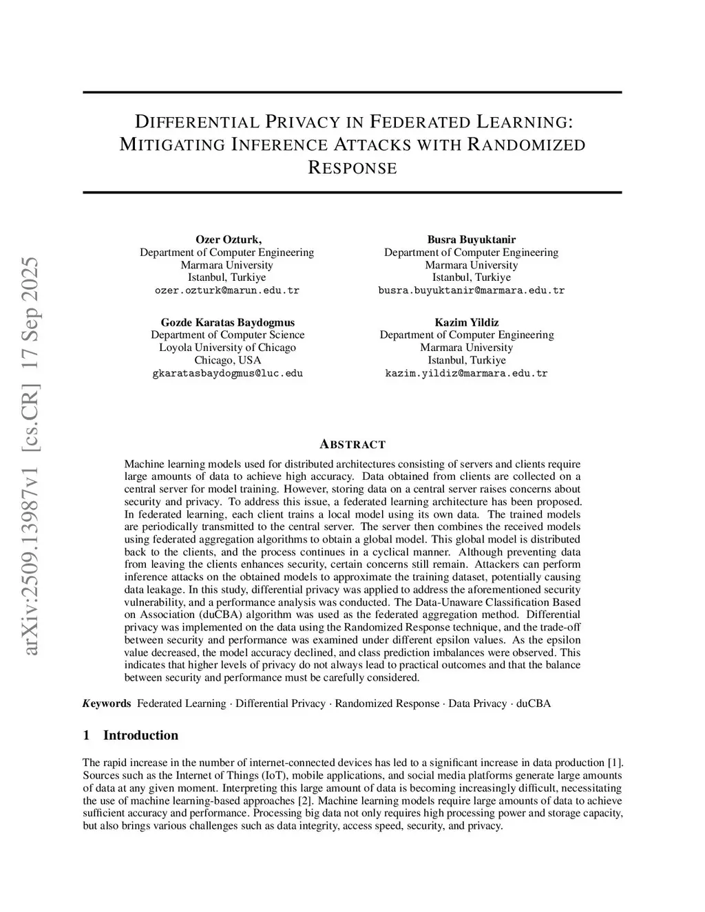 Machine learning models used for distributed architectures consisting of servers and clients require large amounts of data to achieve high accuracy. Data obtained from clients are collected on a central server for model training. However, storing data on a central server raises concerns about security and privacy. To address this issue, a federated learning architecture has been proposed. In federated learning, each client trains a local model using its own data. The trained models are periodically transmitted to the central server. The server then combines the received models using federated aggregation algorithms to obtain a global model. This global model is distributed back to the clients, and the process continues in a cyclical manner. Although preventing data from leaving the clients enhances security, certain concerns still remain. Attackers can perform inference attacks on the obtained models to approximate the training dataset, potentially causing data leakage. In this study, differential privacy was applied to address the aforementioned security vulnerability, and a performance analysis was conducted. The Data-Unaware Classification Based on Association (duCBA) algorithm was used as the federated aggregation method. Differential privacy was implemented on the data using the Randomized Response technique, and the trade-off between security and performance was examined under different epsilon values. As the epsilon value decreased, the model accuracy declined, and class prediction imbalances were observed. This indicates that higher levels of privacy do not always lead to practical outcomes and that the balance between security and performance must be carefully considered.