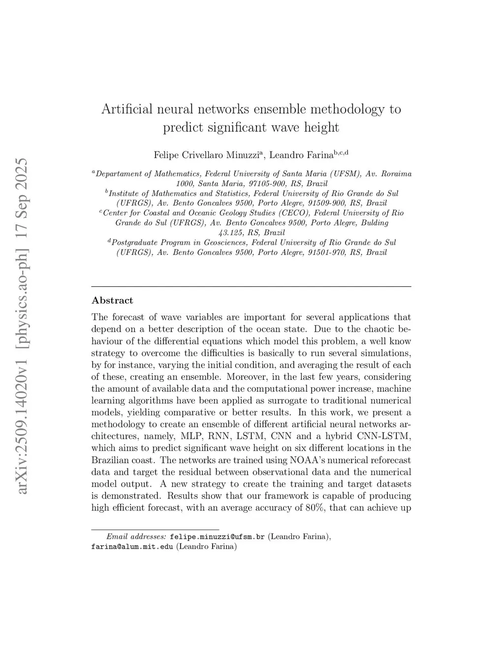 The forecast of wave variables are important for several applications that depend on a better description of the ocean state. Due to the chaotic behaviour of the differential equations which model this problem, a well know strategy to overcome the difficulties is basically to run several simulations, by for instance, varying the initial condition, and averaging the result of each of these, creating an ensemble. Moreover, in the last few years, considering the amount of available data and the computational power increase, machine learning algorithms have been applied as surrogate to traditional numerical models, yielding comparative or better results. In this work, we present a methodology to create an ensemble of different artificial neural networks architectures, namely, MLP, RNN, LSTM, CNN and a hybrid CNN-LSTM, which aims to predict significant wave height on six different locations in the Brazilian coast. The networks are trained using NOAA's numerical reforecast data and target the residual between observational data and the numerical model output. A new strategy to create the training and target datasets is demonstrated. Results show that our framework is capable of producing high efficient forecast, with an average accuracy of , that can achieve up to in the best case scenario, which means reduction in error metrics if compared to NOAA's numerical model, and a increasingly reduction of computational cost.