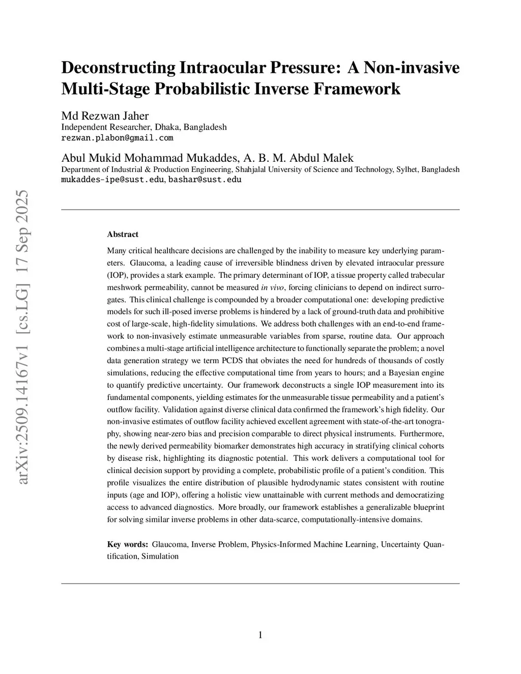Many critical healthcare decisions are challenged by the inability to measure key underlying parameters. Glaucoma, a leading cause of irreversible blindness driven by elevated intraocular pressure (IOP), provides a stark example. The primary determinant of IOP, a tissue property called trabecular meshwork permeability, cannot be measured in vivo, forcing clinicians to depend on indirect surrogates. This clinical challenge is compounded by a broader computational one: developing predictive models for such ill-posed inverse problems is hindered by a lack of ground-truth data and prohibitive cost of large-scale, high-fidelity simulations. We address both challenges with an end-to-end framework to noninvasively estimate unmeasurable variables from sparse, routine data. Our approach combines a multi-stage artificial intelligence architecture to functionally separate the problem; a novel data generation strategy we term PCDS that obviates the need for hundreds of thousands of costly simulations, reducing the effective computational time from years to hours; and a Bayesian engine to quantify predictive uncertainty. Our framework deconstructs a single IOP measurement into its fundamental components from routine inputs only, yielding estimates for the unmeasurable tissue permeability and a patient's outflow facility. Our noninvasively estimated outflow facility achieved excellent agreement with state-of-the-art tonography with precision comparable to direct physical instruments. Furthermore, the newly derived permeability biomarker demonstrates high accuracy in stratifying clinical cohorts by disease risk, highlighting its diagnostic potential. More broadly, our framework establishes a generalizable blueprint for solving similar inverse problems in other data-scarce, computationally-intensive domains.