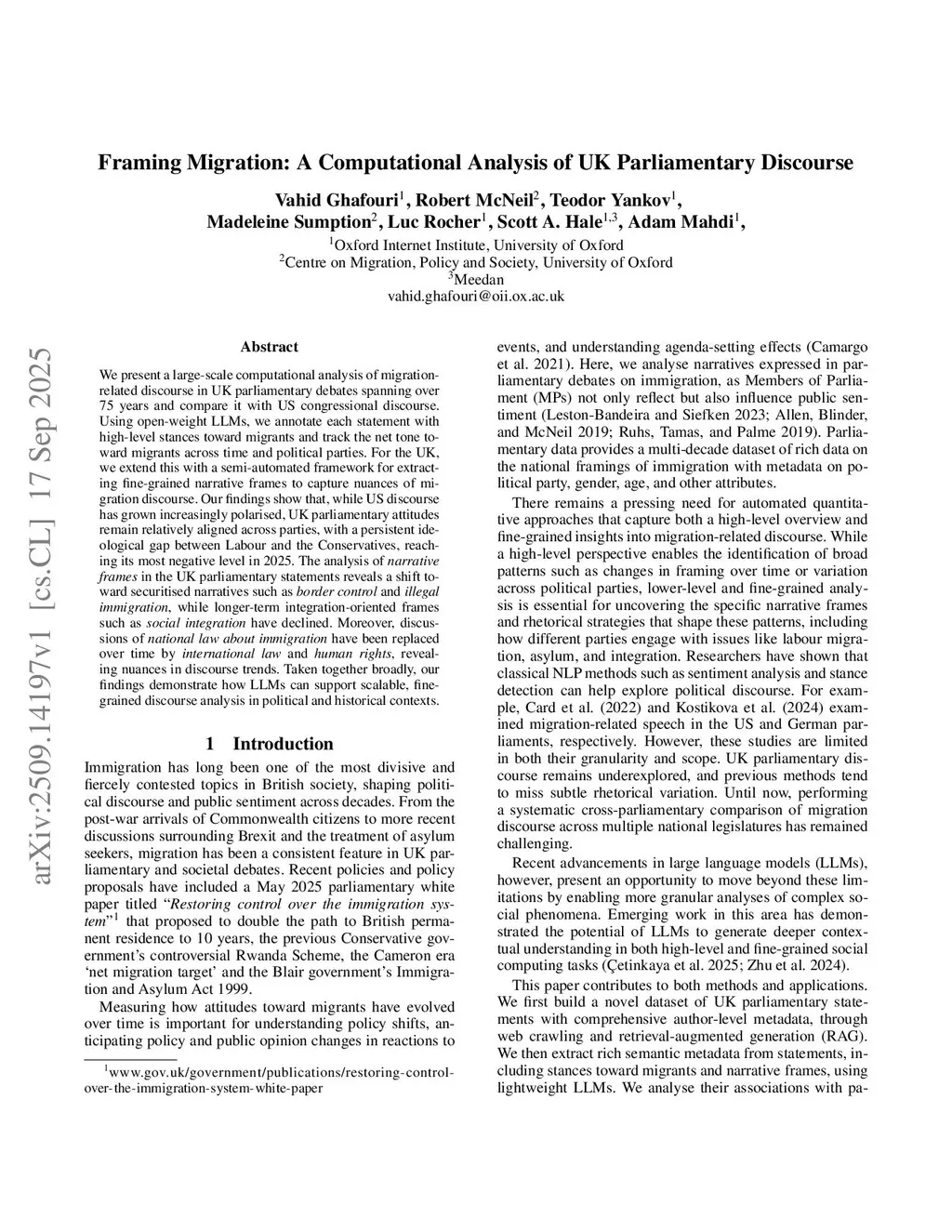 Framing Migration: A Computational Analysis of UK Parliamentary Discourse
