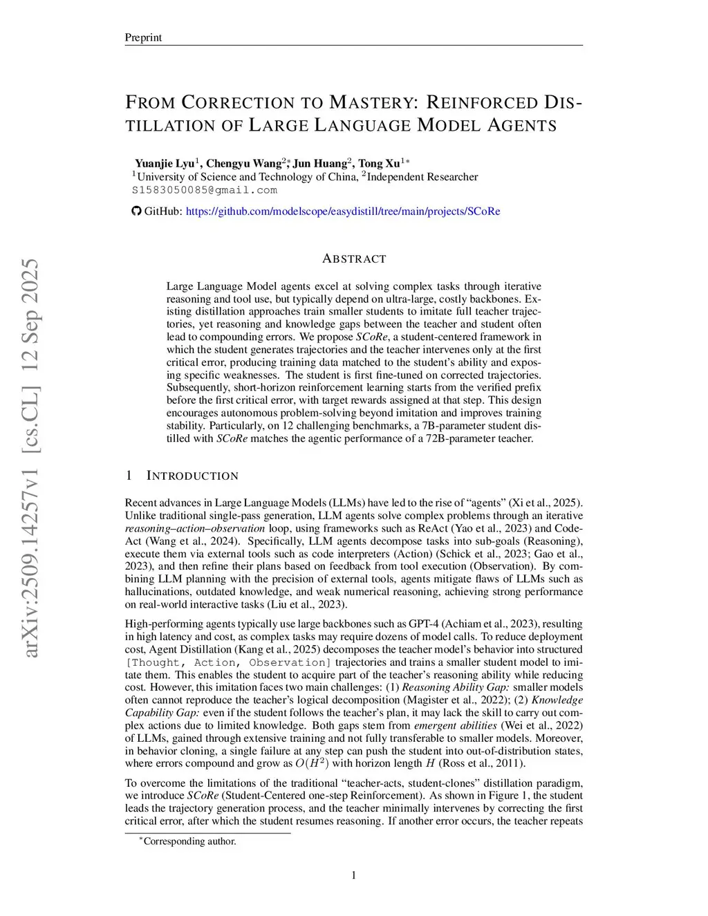 Large Language Model agents excel at solving complex tasks through iterative reasoning and tool use, but typically depend on ultra-large, costly backbones. Existing distillation approaches train smaller students to imitate full teacher trajectories, yet reasoning and knowledge gaps between the teacher and student can cause compounding errors. We propose SCoRe, a student-centered framework in which the student generates training trajectories and the teacher corrects only the earliest error, producing training data matched to the student's ability and exposing specific weaknesses. The student is first fine-tuned on corrected trajectories. Subsequently, short-horizon reinforcement learning starts from the verified prefix preceding the earliest error, with target rewards assigned at that step. This design encourages autonomous problem-solving beyond imitation and enhances training stability. On 12 challenging benchmarks, a 7B-parameter student distilled with SCoRe matches the agentic performance of a 72B-parameter teacher.