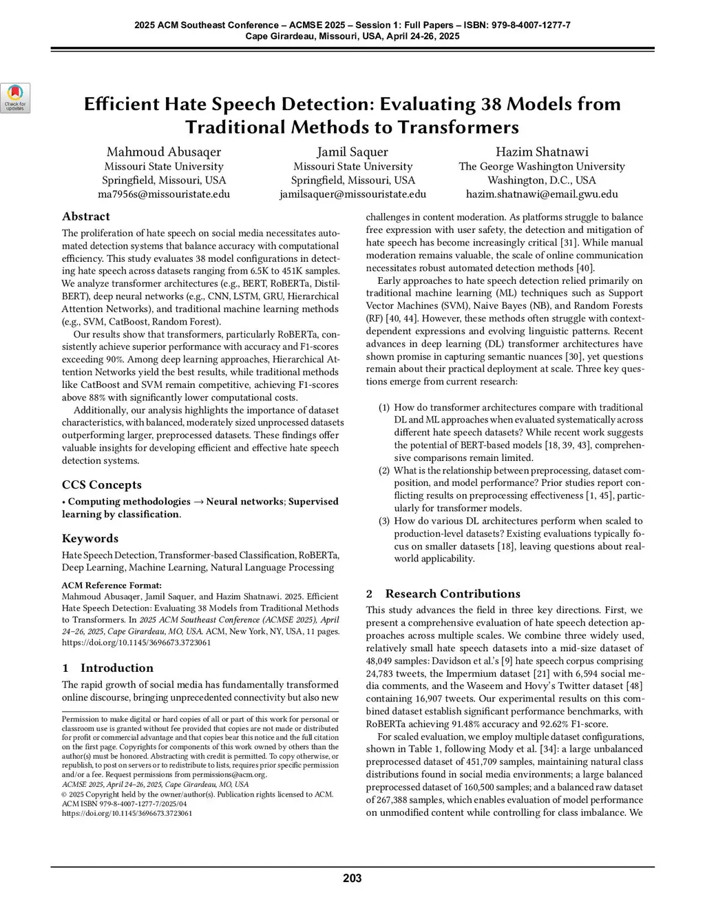 The proliferation of hate speech on social media necessitates automated detection systems that balance accuracy with computational efficiency. This study evaluates 38 model configurations in detecting hate speech across datasets ranging from 6.5K to 451K samples. We analyze transformer architectures (e.g., BERT, RoBERTa, Distil-BERT), deep neural networks (e.g., CNN, LSTM, GRU, Hierarchical Attention Networks), and traditional machine learning methods (e.g., SVM, CatBoost, Random Forest). Our results show that transformers, particularly RoBERTa, consistently achieve superior performance with accuracy and F1-scores exceeding 90%. Among deep learning approaches, Hierarchical Attention Networks yield the best results, while traditional methods like CatBoost and SVM remain competitive, achieving F1-scores above 88% with significantly lower computational costs. Additionally, our analysis highlights the importance of dataset characteristics, with balanced, moderately sized unprocessed datasets outperforming larger, preprocessed datasets. These findings offer valuable insights for developing efficient and effective hate speech detection systems.