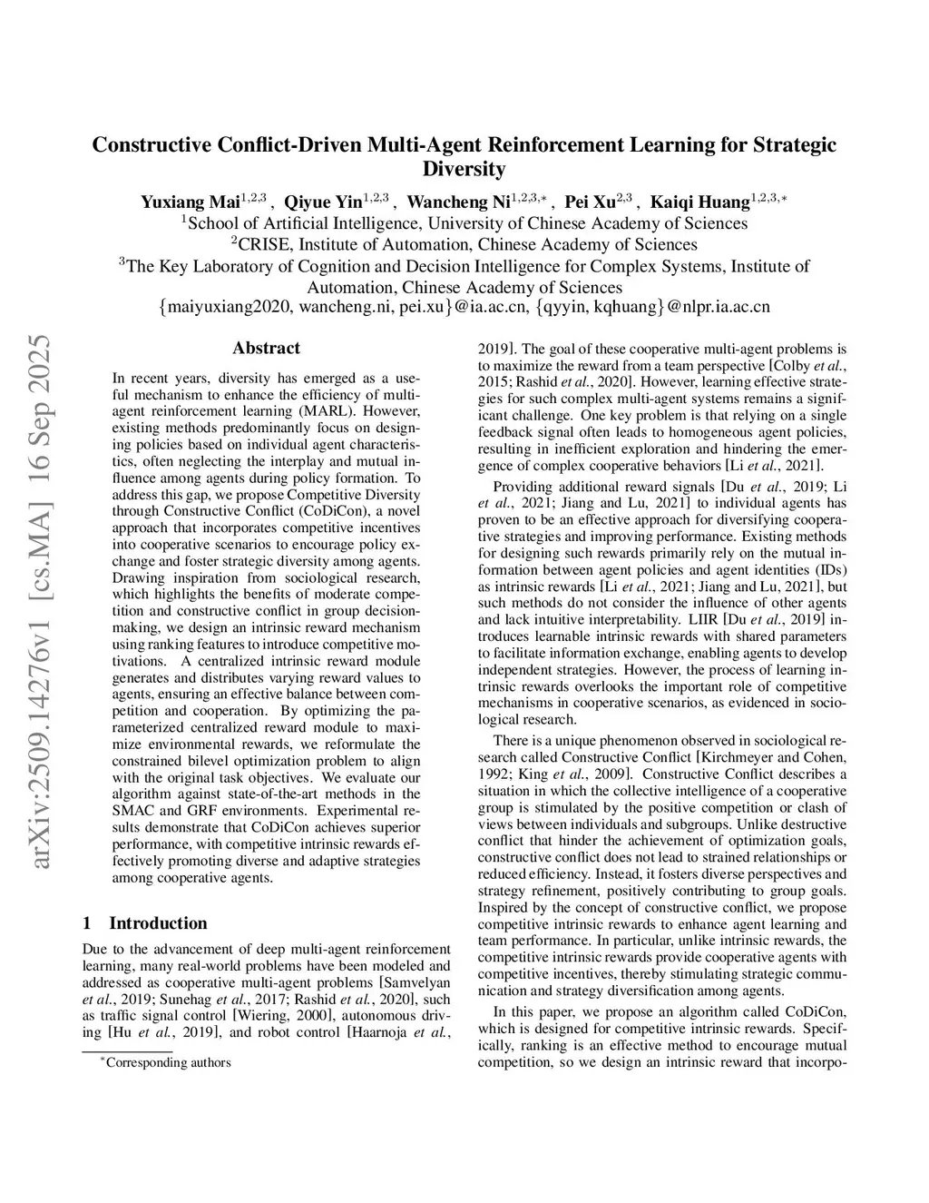 In recent years, diversity has emerged as a useful mechanism to enhance the efficiency of multi-agent reinforcement learning (MARL). However, existing methods predominantly focus on designing policies based on individual agent characteristics, often neglecting the interplay and mutual influence among agents during policy formation. To address this gap, we propose Competitive Diversity through Constructive Conflict (CoDiCon), a novel approach that incorporates competitive incentives into cooperative scenarios to encourage policy exchange and foster strategic diversity among agents. Drawing inspiration from sociological research, which highlights the benefits of moderate competition and constructive conflict in group decision-making, we design an intrinsic reward mechanism using ranking features to introduce competitive motivations. A centralized intrinsic reward module generates and distributes varying reward values to agents, ensuring an effective balance between competition and cooperation. By optimizing the parameterized centralized reward module to maximize environmental rewards, we reformulate the constrained bilevel optimization problem to align with the original task objectives. We evaluate our algorithm against state-of-the-art methods in the SMAC and GRF environments. Experimental results demonstrate that CoDiCon achieves superior performance, with competitive intrinsic rewards effectively promoting diverse and adaptive strategies among cooperative agents.