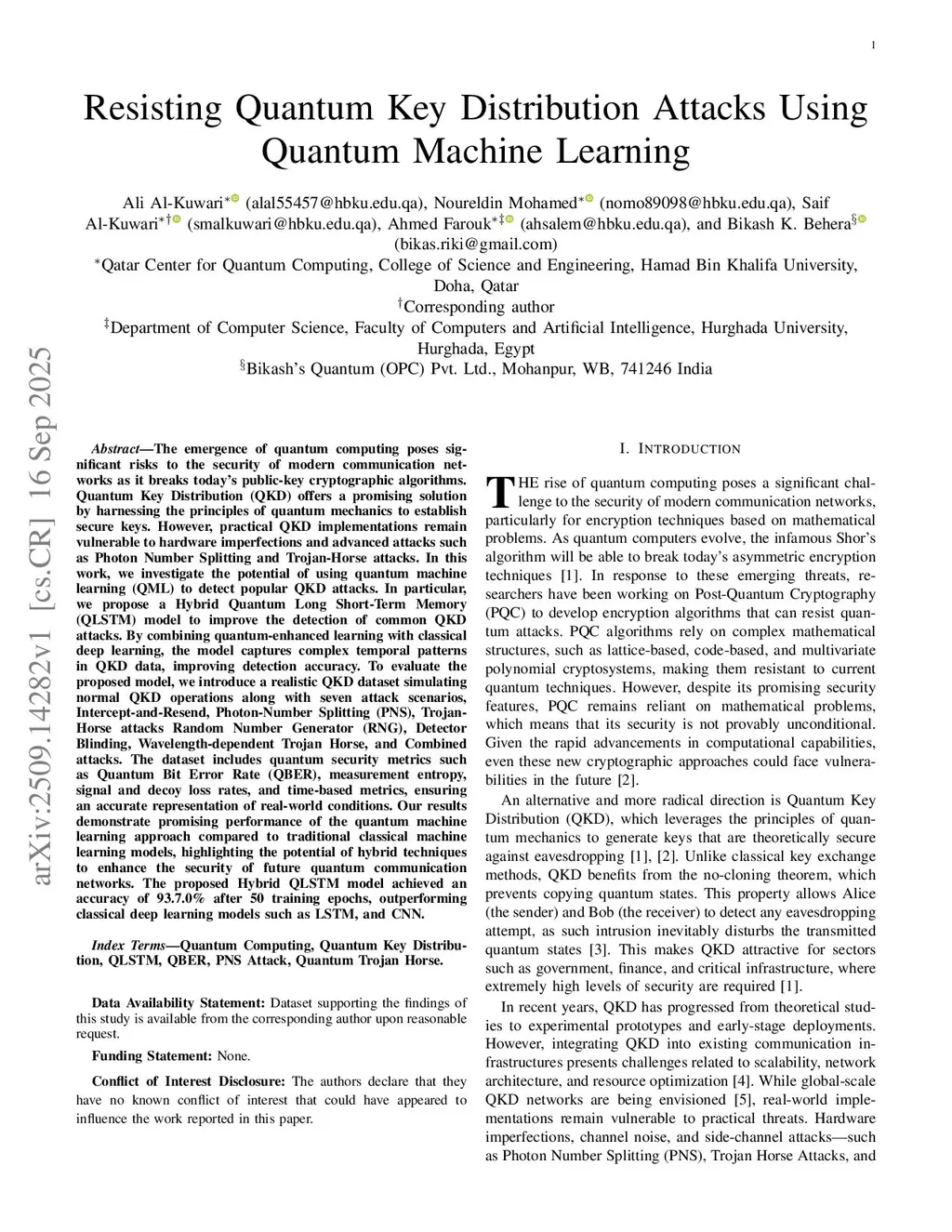 The emergence of quantum computing poses significant risks to the security of modern communication networks as it breaks today's public-key cryptographic algorithms. Quantum Key Distribution (QKD) offers a promising solution by harnessing the principles of quantum mechanics to establish secure keys. However, practical QKD implementations remain vulnerable to hardware imperfections and advanced attacks such as Photon Number Splitting and Trojan-Horse attacks. In this work, we investigate the potential of quantum machine learning (QML) to detect QKD attacks. In particular, we propose a Hybrid Quantum Long Short-Term Memory (QLSTM) model to improve detection performance. By combining quantum-enhanced learning with classical deep learning, the model captures temporal patterns in QKD data, improving detection accuracy. To evaluate the proposed model, we introduce a QKD dataset that simulates typical operations along with multiple attack scenarios, including Intercept-and-Resend, Photon-Number Splitting, Trojan-Horse, Detector Blinding, and Combined attacks. The dataset includes Quantum Bit Error Rate (QBER), signal and decoy loss rates, and time-based metrics. Our results demonstrate the promising performance of the quantum machine learning approach compared to classical models. The proposed Hybrid QLSTM achieved an accuracy of 94.7% after 50 training epochs. The evaluation is conducted on a semi-realistic, simulation-generated decoy-state BB84 dataset, and the reported performance should be interpreted as a proof-of-concept rather than a final assessment on field-deployed QKD systems.