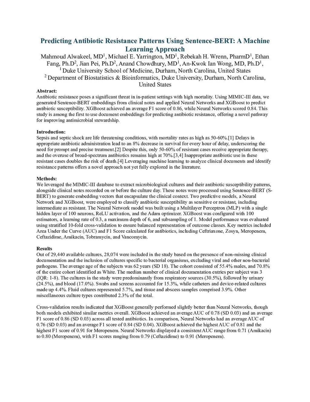 Antibiotic resistance poses a significant threat in in-patient settings with high mortality. Using MIMIC-III data, we generated Sentence-BERT embeddings from clinical notes and applied Neural Networks and XGBoost to predict antibiotic susceptibility. XGBoost achieved an average F1 score of 0.86, while Neural Networks scored 0.84. This study is among the first to use document embeddings for predicting antibiotic resistance, offering a novel pathway for improving antimicrobial stewardship.