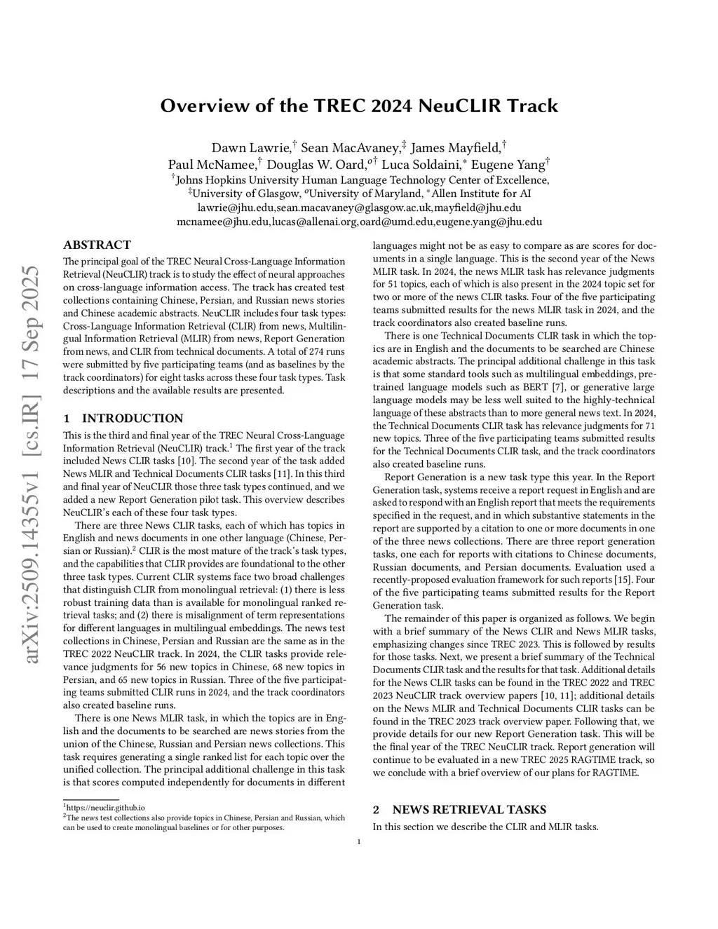 The principal goal of the TREC Neural Cross-Language Information Retrieval (NeuCLIR) track is to study the effect of neural approaches on cross-language information access. The track has created test collections containing Chinese, Persian, and Russian news stories and Chinese academic abstracts. NeuCLIR includes four task types: Cross-Language Information Retrieval (CLIR) from news, Multilingual Information Retrieval (MLIR) from news, Report Generation from news, and CLIR from technical documents. A total of 274 runs were submitted by five participating teams (and as baselines by the track coordinators) for eight tasks across these four task types. Task descriptions and the available results are presented.