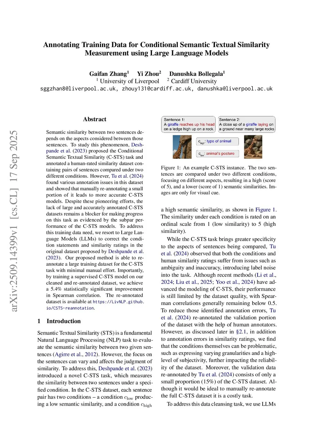 Semantic similarity between two sentences depends on the aspects considered between those sentences. To study this phenomenon, Deshpande et al. (2023) proposed the Conditional Semantic Textual Similarity (C-STS) task and annotated a human-rated similarity dataset containing pairs of sentences compared under two different conditions. However, Tu et al. (2024) found various annotation issues in this dataset and showed that manually re-annotating a small portion of it leads to more accurate C-STS models. Despite these pioneering efforts, the lack of large and accurately annotated C-STS datasets remains a blocker for making progress on this task as evidenced by the subpar performance of the C-STS models. To address this training data need, we resort to Large Language Models (LLMs) to correct the condition statements and similarity ratings in the original dataset proposed by Deshpande et al. (2023). Our proposed method is able to re-annotate a large training dataset for the C-STS task with minimal manual effort. Importantly, by training a supervised C-STS model on our cleaned and re-annotated dataset, we achieve a 5.4% statistically significant improvement in Spearman correlation. The re-annotated dataset is available atthis https URL.
