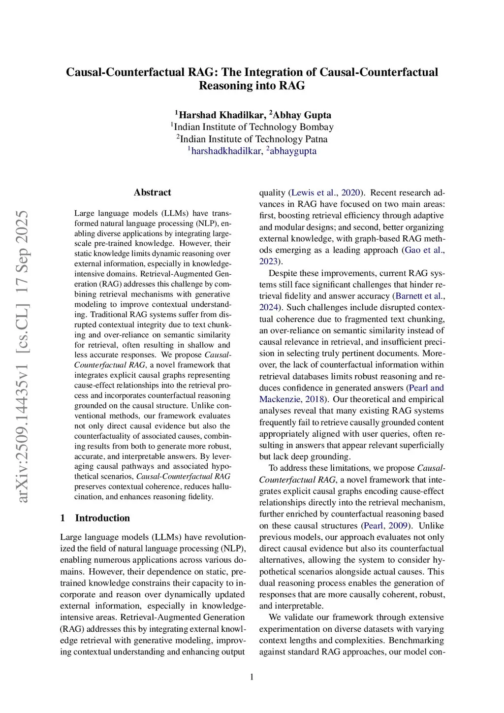 Large language models (LLMs) have transformed natural language processing (NLP), enabling diverse applications by integrating large-scale pre-trained knowledge. However, their static knowledge limits dynamic reasoning over external information, especially in knowledge-intensive domains. Retrieval-Augmented Generation (RAG) addresses this challenge by combining retrieval mechanisms with generative modeling to improve contextual understanding. Traditional RAG systems suffer from disrupted contextual integrity due to text chunking and over-reliance on semantic similarity for retrieval, often resulting in shallow and less accurate responses. We propose Causal-Counterfactual RAG, a novel framework that integrates explicit causal graphs representing cause-effect relationships into the retrieval process and incorporates counterfactual reasoning grounded on the causal structure. Unlike conventional methods, our framework evaluates not only direct causal evidence but also the counterfactuality of associated causes, combining results from both to generate more robust, accurate, and interpretable answers. By leveraging causal pathways and associated hypothetical scenarios, Causal-Counterfactual RAG preserves contextual coherence, reduces hallucination, and enhances reasoning fidelity.