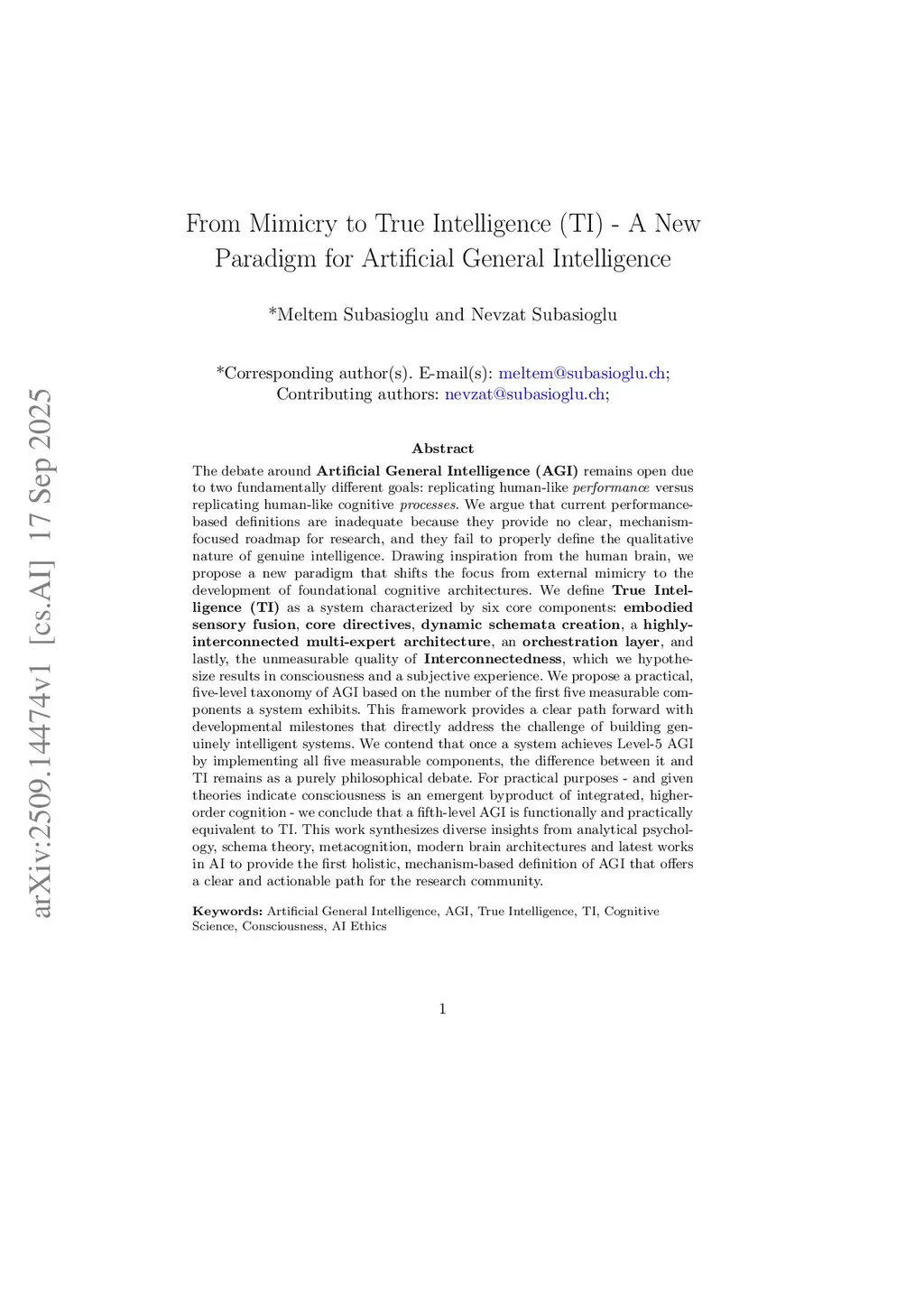 The debate around Artificial General Intelligence (AGI) remains open due to two fundamentally different goals: replicating human-like performance versus replicating human-like cognitive processes. We argue that current performance-based definitions are inadequate because they provide no clear, mechanism-focused roadmap for research, and they fail to properly define the qualitative nature of genuine intelligence. Drawing inspiration from the human brain, we propose a new paradigm that shifts the focus from external mimicry to the development of foundational cognitive architectures. We define True Intelligence (TI) as a system characterized by six core components: embodied sensory fusion, core directives, dynamic schemata creation, a highly-interconnected multi-expert architecture, an orchestration layer, and lastly, the unmeasurable quality of Interconnectedness, which we hypothesize results in consciousness and a subjective experience. We propose a practical, five-level taxonomy of AGI based on the number of the first five measurable components a system exhibits. This framework provides a clear path forward with developmental milestones that directly address the challenge of building genuinely intelligent systems. We contend that once a system achieves Level-5 AGI by implementing all five measurable components, the difference between it and TI remains as a purely philosophical debate. For practical purposes - and given theories indicate consciousness is an emergent byproduct of integrated, higher-order cognition - we conclude that a fifth-level AGI is functionally and practically equivalent to TI. This work synthesizes diverse insights from analytical psychology, schema theory, metacognition, modern brain architectures and latest works in AI to provide the first holistic, mechanism-based definition of AGI that offers a clear and actionable path for the research community.