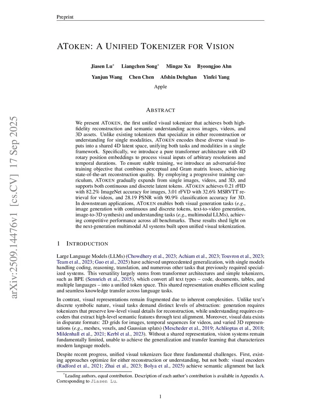 We present AToken, the first unified visual tokenizer that achieves both high-fidelity reconstruction and semantic understanding across images, videos, and 3D assets. Unlike existing tokenizers that specialize in either reconstruction or understanding for single modalities, AToken encodes these diverse visual inputs into a shared 4D latent space, unifying both tasks and modalities in a single framework. Specifically, we introduce a pure transformer architecture with 4D rotary position embeddings to process visual inputs of arbitrary resolutions and temporal durations. To ensure stable training, we introduce an adversarial-free training objective that combines perceptual and Gram matrix losses, achieving state-of-the-art reconstruction quality. By employing a progressive training curriculum, AToken gradually expands from single images, videos, and 3D, and supports both continuous and discrete latent tokens. AToken achieves 0.21 rFID with 82.2% ImageNet accuracy for images, 3.01 rFVD with 40.2% MSRVTT retrieval for videos, and 28.28 PSNR with 90.9% classification accuracy for 3D.. In downstream applications, AToken enables both visual generation tasks (e.g., image generation with continuous and discrete tokens, text-to-video generation, image-to-3D synthesis) and understanding tasks (e.g., multimodal LLMs), achieving competitive performance across all benchmarks. These results shed light on the next-generation multimodal AI systems built upon unified visual tokenization.