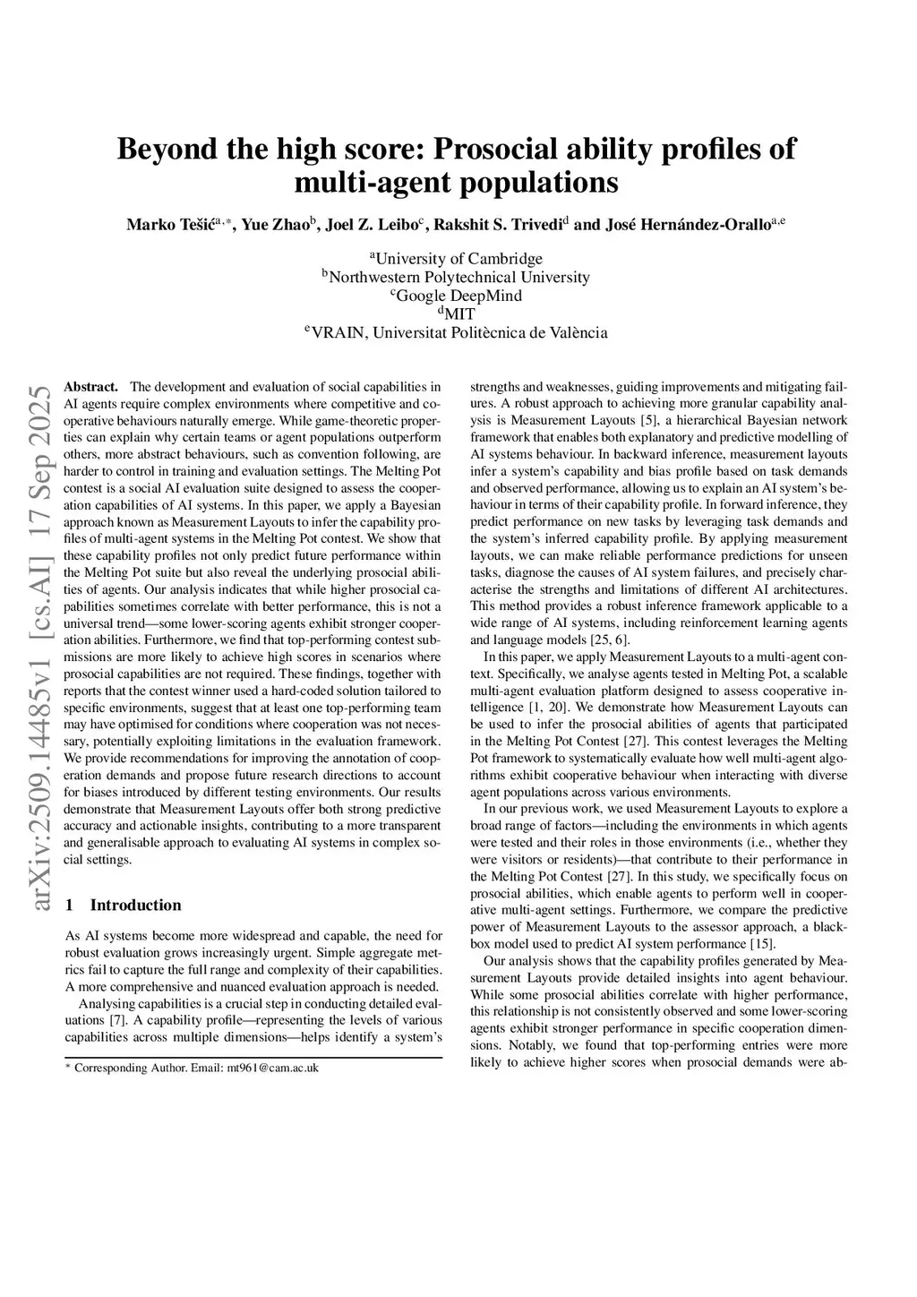 The development and evaluation of social capabilities in AI agents require complex environments where competitive and cooperative behaviours naturally emerge. While game-theoretic properties can explain why certain teams or agent populations outperform others, more abstract behaviours, such as convention following, are harder to control in training and evaluation settings. The Melting Pot contest is a social AI evaluation suite designed to assess the cooperation capabilities of AI systems. In this paper, we apply a Bayesian approach known as Measurement Layouts to infer the capability profiles of multi-agent systems in the Melting Pot contest. We show that these capability profiles not only predict future performance within the Melting Pot suite but also reveal the underlying prosocial abilities of agents. Our analysis indicates that while higher prosocial capabilities sometimes correlate with better performance, this is not a universal trend-some lower-scoring agents exhibit stronger cooperation abilities. Furthermore, we find that top-performing contest submissions are more likely to achieve high scores in scenarios where prosocial capabilities are not required. These findings, together with reports that the contest winner used a hard-coded solution tailored to specific environments, suggest that at least one top-performing team may have optimised for conditions where cooperation was not necessary, potentially exploiting limitations in the evaluation framework. We provide recommendations for improving the annotation of cooperation demands and propose future research directions to account for biases introduced by different testing environments. Our results demonstrate that Measurement Layouts offer both strong predictive accuracy and actionable insights, contributing to a more transparent and generalisable approach to evaluating AI systems in complex social settings.