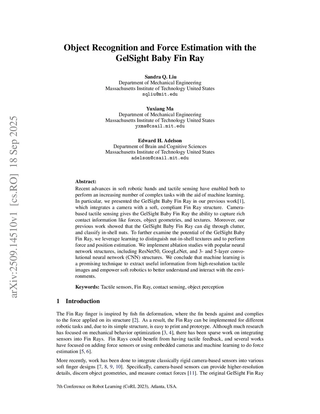 Object Recognition and Force Estimation with the GelSight Baby Fin Ray
