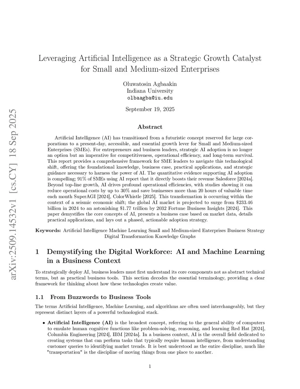 Artificial Intelligence (AI) has transitioned from a futuristic concept reserved for large corporations to a present-day, accessible, and essential growth lever for Small and Medium-sized Enterprises (SMEs). For entrepreneurs and business leaders, strategic AI adoption is no longer an option but an imperative for competitiveness, operational efficiency, and long-term survival. This report provides a comprehensive framework for SME leaders to navigate this technological shift, offering the foundational knowledge, business case, practical applications, and strategic guidance necessary to harness the power of AI. The quantitative evidence supporting AI adoption is compelling; 91% of SMEs using AI report that it directly boosts their revenue. Beyond top-line growth, AI drives profound operational efficiencies, with studies showing it can reduce operational costs by up to 30% and save businesses more than 20 hours of valuable time each month. This transformation is occurring within the context of a seismic economic shift; the global AI market is projected to surge from $233.46 Billion in 2024 to an astonishing $1.77 Trillion by 2032. This paper demystifies the core concepts of AI, presents a business case based on market data, details practical applications, and lays out a phased, actionable adoption strategy.