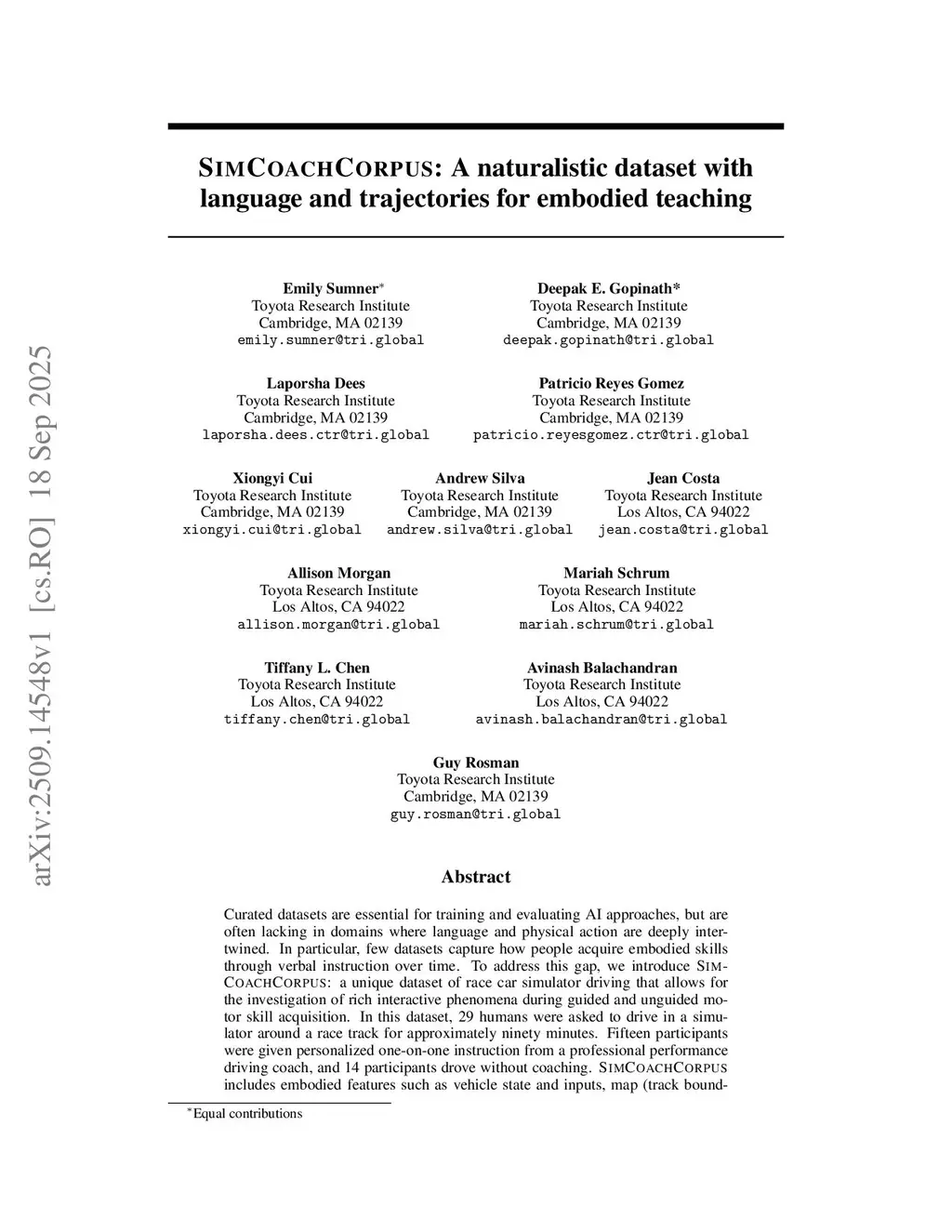 Curated datasets are essential for training and evaluating AI approaches, but are often lacking in domains where language and physical action are deeply intertwined. In particular, few datasets capture how people acquire embodied skills through verbal instruction over time. To address this gap, we introduce SimCoachCorpus: a unique dataset of race car simulator driving that allows for the investigation of rich interactive phenomena during guided and unguided motor skill acquisition. In this dataset, 29 humans were asked to drive in a simulator around a race track for approximately ninety minutes. Fifteen participants were given personalized one-on-one instruction from a professional performance driving coach, and 14 participants drove without coaching. \name\ includes embodied features such as vehicle state and inputs, map (track boundaries and raceline), and cone landmarks. These are synchronized with concurrent verbal coaching from a professional coach and additional feedback at the end of each lap. We further provide annotations of coaching categories for each concurrent feedback utterance, ratings on students' compliance with coaching advice, and self-reported cognitive load and emotional state of participants (gathered from surveys during the study). The dataset includes over 20,000 concurrent feedback utterances, over 400 terminal feedback utterances, and over 40 hours of vehicle driving data. Our naturalistic dataset can be used for investigating motor learning dynamics, exploring linguistic phenomena, and training computational models of teaching. We demonstrate applications of this dataset for in-context learning, imitation learning, and topic modeling. The dataset introduced in this work will be released publicly upon publication of the peer-reviewed version of this paper. Researchers interested in early access may register atthis https URL.