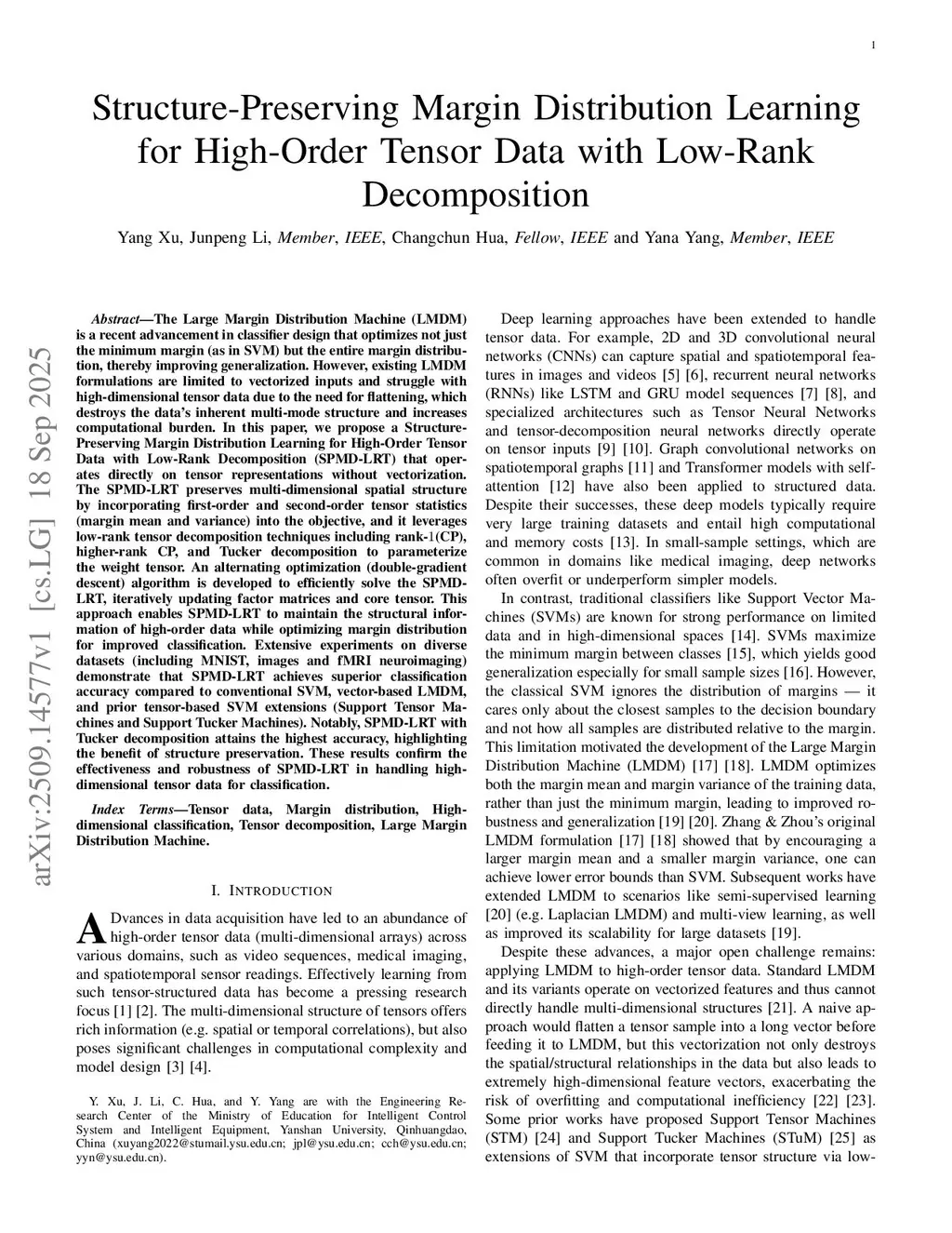 The Large Margin Distribution Machine (LMDM) is a recent advancement in classifier design that optimizes not just the minimum margin (as in SVM) but the entire margin distribution, thereby improving generalization. However, existing LMDM formulations are limited to vectorized inputs and struggle with high-dimensional tensor data due to the need for flattening, which destroys the data's inherent multi-mode structure and increases computational burden. In this paper, we propose a Structure-Preserving Margin Distribution Learning for High-Order Tensor Data with Low-Rank Decomposition (SPMD-LRT) that operates directly on tensor representations without vectorization. The SPMD-LRT preserves multi-dimensional spatial structure by incorporating first-order and second-order tensor statistics (margin mean and variance) into the objective, and it leverages low-rank tensor decomposition techniques including rank-1(CP), higher-rank CP, and Tucker decomposition to parameterize the weight tensor. An alternating optimization (double-gradient descent) algorithm is developed to efficiently solve the SPMD-LRT, iteratively updating factor matrices and core tensor. This approach enables SPMD-LRT to maintain the structural information of high-order data while optimizing margin distribution for improved classification. Extensive experiments on diverse datasets (including MNIST, images and fMRI neuroimaging) demonstrate that SPMD-LRT achieves superior classification accuracy compared to conventional SVM, vector-based LMDM, and prior tensor-based SVM extensions (Support Tensor Machines and Support Tucker Machines). Notably, SPMD-LRT with Tucker decomposition attains the highest accuracy, highlighting the benefit of structure preservation. These results confirm the effectiveness and robustness of SPMD-LRT in handling high-dimensional tensor data for classification.