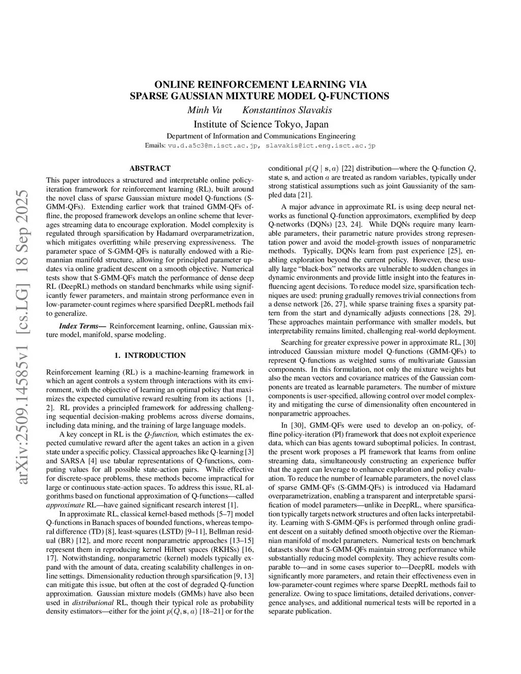 Online reinforcement learning via sparse Gaussian mixture model Q-functions