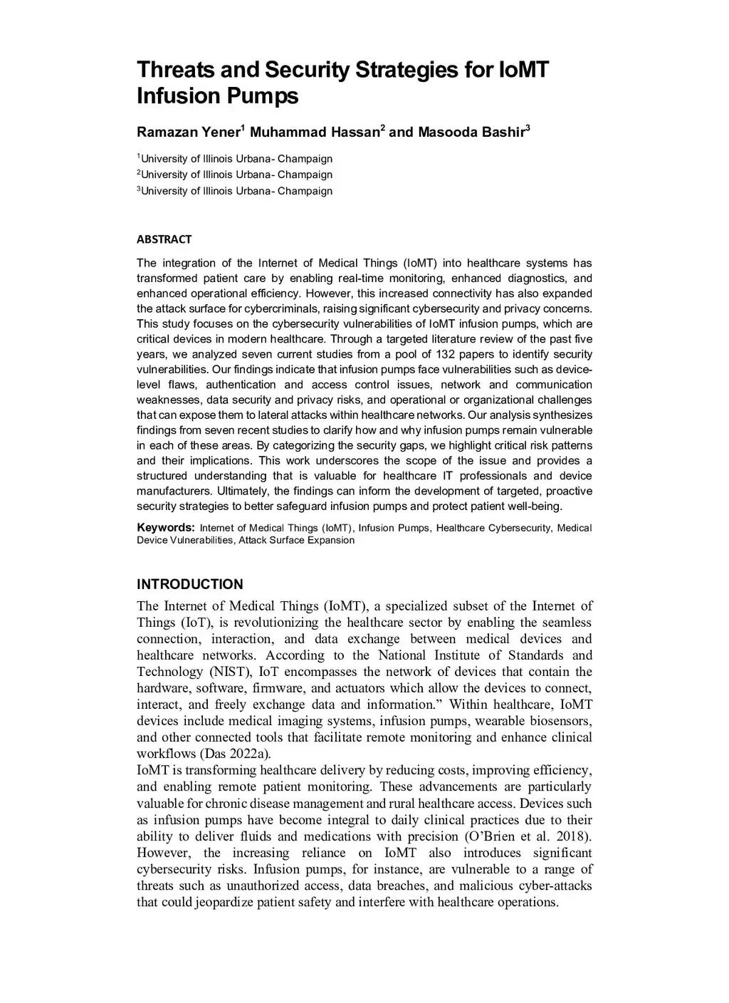 The integration of the Internet of Medical Things (IoMT) into healthcare systems has transformed patient care by enabling real-time monitoring, enhanced diagnostics, and enhanced operational efficiency. However, this increased connectivity has also expanded the attack surface for cybercriminals, raising significant cybersecurity and privacy concerns. This study focuses on the cybersecurity vulnerabilities of IoMT infusion pumps, which are critical devices in modern healthcare. Through a targeted literature review of the past five years, we analyzed seven current studies from a pool of 132 papers to identify security vulnerabilities. Our findings indicate that infusion pumps face vulnerabilities such as device-level flaws, authentication and access control issues, network and communication weaknesses, data security and privacy risks, and operational or organizational challenges that can expose them to lateral attacks within healthcare networks. Our analysis synthesizes findings from seven recent studies to clarify how and why infusion pumps remain vulnerable in each of these areas. By categorizing the security gaps, we highlight critical risk patterns and their implications. This work underscores the scope of the issue and provides a structured understanding that is valuable for healthcare IT professionals and device manufacturers. Ultimately, the findings can inform the development of targeted, proactive security strategies to better safeguard infusion pumps and protect patient well-being.
