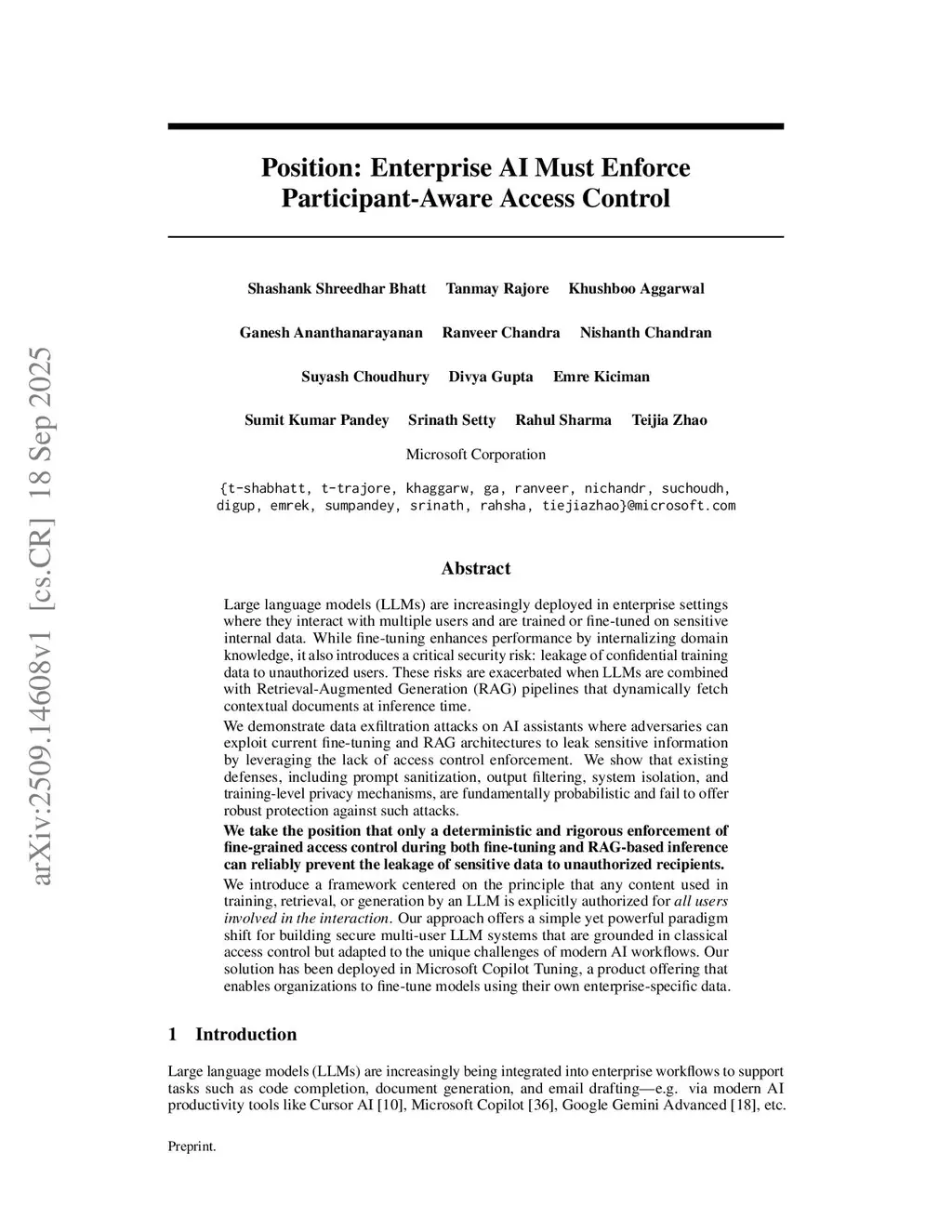 Large language models (LLMs) are increasingly deployed in enterprise settings where they interact with multiple users and are trained or fine-tuned on sensitive internal data. While fine-tuning enhances performance by internalizing domain knowledge, it also introduces a critical security risk: leakage of confidential training data to unauthorized users. These risks are exacerbated when LLMs are combined with Retrieval-Augmented Generation (RAG) pipelines that dynamically fetch contextual documents at inference time.We demonstrate data exfiltration attacks on AI assistants where adversaries can exploit current fine-tuning and RAG architectures to leak sensitive information by leveraging the lack of access control enforcement. We show that existing defenses, including prompt sanitization, output filtering, system isolation, and training-level privacy mechanisms, are fundamentally probabilistic and fail to offer robust protection against such attacks.We take the position that only a deterministic and rigorous enforcement of fine-grained access control during both fine-tuning and RAG-based inference can reliably prevent the leakage of sensitive data to unauthorized recipients.We introduce a framework centered on the principle that any content used in training, retrieval, or generation by an LLM is explicitly authorized for \emph{all users involved in the interaction}. Our approach offers a simple yet powerful paradigm shift for building secure multi-user LLM systems that are grounded in classical access control but adapted to the unique challenges of modern AI workflows. Our solution has been deployed in Microsoft Copilot Tuning, a product offering that enables organizations to fine-tune models using their own enterprise-specific data.