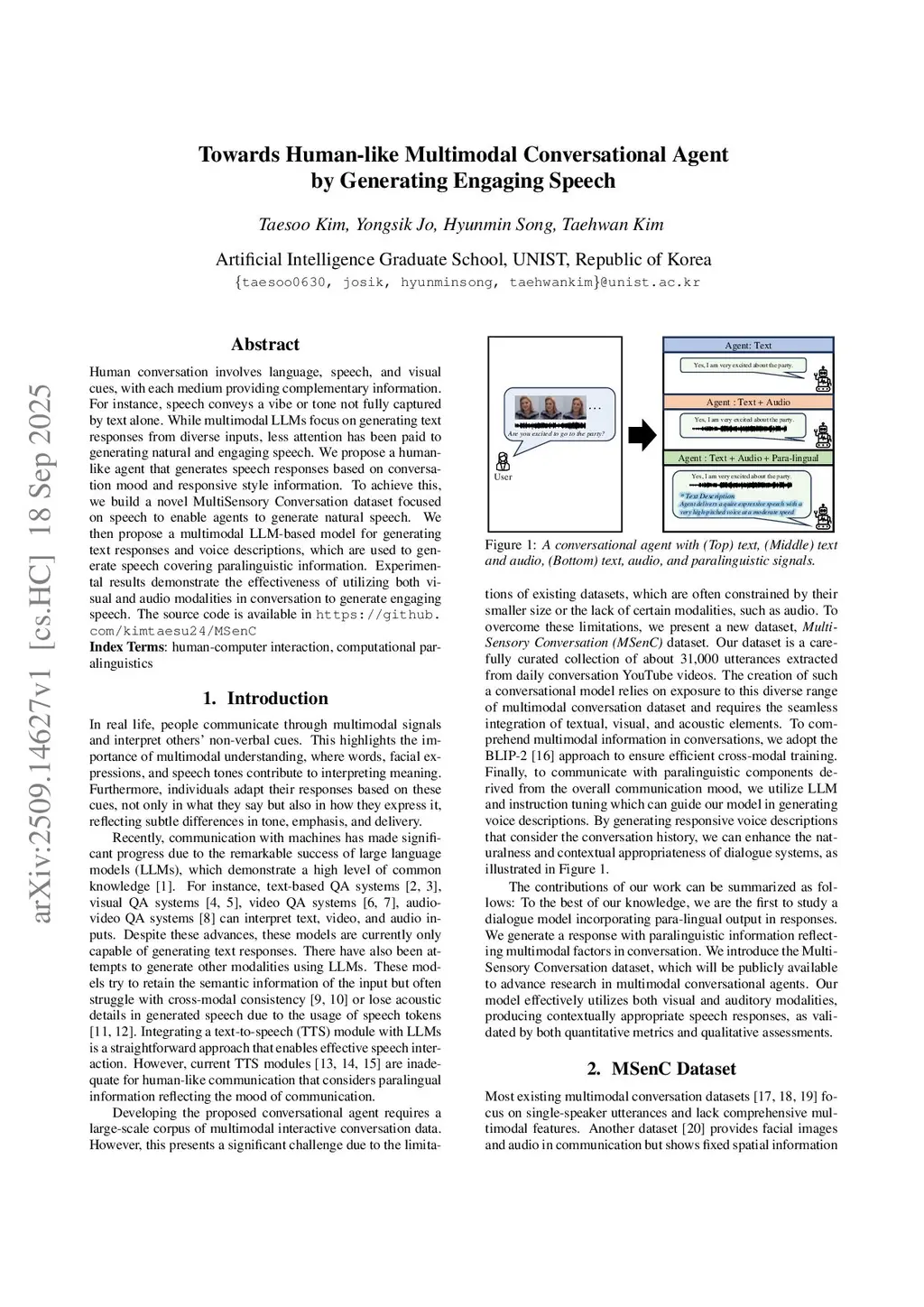 Human conversation involves language, speech, and visual cues, with each medium providing complementary information. For instance, speech conveys a vibe or tone not fully captured by text alone. While multimodal LLMs focus on generating text responses from diverse inputs, less attention has been paid to generating natural and engaging speech. We propose a human-like agent that generates speech responses based on conversation mood and responsive style information. To achieve this, we build a novel MultiSensory Conversation dataset focused on speech to enable agents to generate natural speech. We then propose a multimodal LLM-based model for generating text responses and voice descriptions, which are used to generate speech covering paralinguistic information. Experimental results demonstrate the effectiveness of utilizing both visual and audio modalities in conversation to generate engaging speech. The source code is available inthis https URL