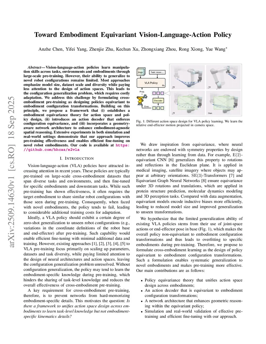 Vision-language-action policies learn manipulation skills across tasks, environments and embodiments through large-scale pre-training. However, their ability to generalize to novel robot configurations remains limited. Most approaches emphasize model size, dataset scale and diversity while paying less attention to the design of action spaces. This leads to the configuration generalization problem, which requires costly adaptation. We address this challenge by formulating cross-embodiment pre-training as designing policies equivariant to embodiment configuration transformations. Building on this principle, we propose a framework that (i) establishes a embodiment equivariance theory for action space and policy design, (ii) introduces an action decoder that enforces configuration equivariance, and (iii) incorporates a geometry-aware network architecture to enhance embodiment-agnostic spatial reasoning. Extensive experiments in both simulation and real-world settings demonstrate that our approach improves pre-training effectiveness and enables efficient fine-tuning on novel robot embodiments. Our code is available atthis https URL