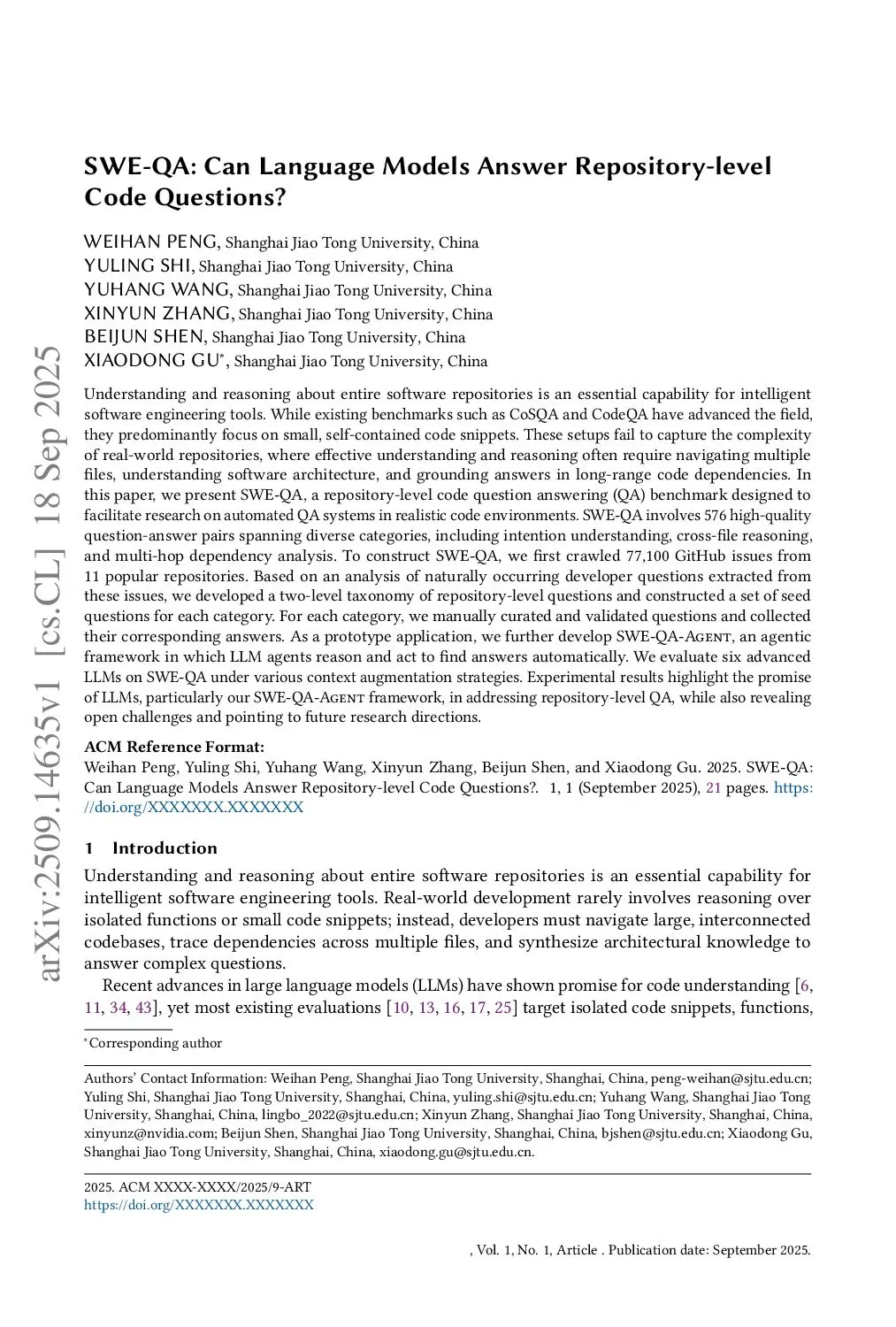 Understanding and reasoning about entire software repositories is an essential capability for intelligent software engineering tools. While existing benchmarks such as CoSQA and CodeQA have advanced the field, they predominantly focus on small, self-contained code snippets. These setups fail to capture the complexity of real-world repositories, where effective understanding and reasoning often require navigating multiple files, understanding software architecture, and grounding answers in long-range code dependencies. In this paper, we present SWE-QA, a repository-level code question answering (QA) benchmark designed to facilitate research on automated QA systems in realistic code environments. SWE-QA involves 576 high-quality question-answer pairs spanning diverse categories, including intention understanding, cross-file reasoning, and multi-hop dependency analysis. To construct SWE-QA, we first crawled 77,100 GitHub issues from 11 popular repositories. Based on an analysis of naturally occurring developer questions extracted from these issues, we developed a two-level taxonomy of repository-level questions and constructed a set of seed questions for each category. For each category, we manually curated and validated questions and collected their corresponding answers. As a prototype application, we further develop SWE-QA-Agent, an agentic framework in which LLM agents reason and act to find answers automatically. We evaluate six advanced LLMs on SWE-QA under various context augmentation strategies. Experimental results highlight the promise of LLMs, particularly our SWE-QA-Agent framework, in addressing repository-level QA, while also revealing open challenges and pointing to future research directions.
