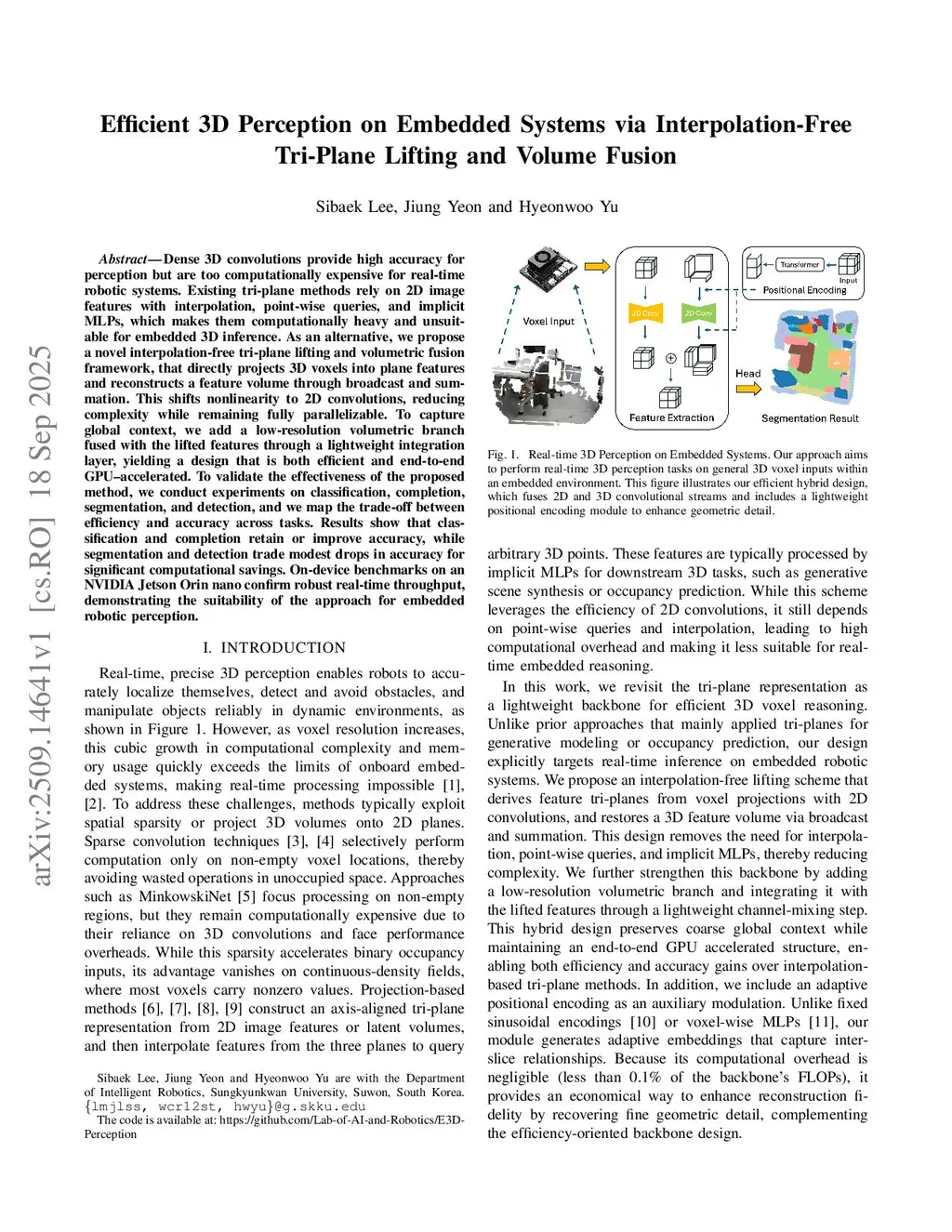Dense 3D convolutions provide high accuracy for perception but are too computationally expensive for real-time robotic systems. Existing tri-plane methods rely on 2D image features with interpolation, point-wise queries, and implicit MLPs, which makes them computationally heavy and unsuitable for embedded 3D inference. As an alternative, we propose a novel interpolation-free tri-plane lifting and volumetric fusion framework, that directly projects 3D voxels into plane features and reconstructs a feature volume through broadcast and summation. This shifts nonlinearity to 2D convolutions, reducing complexity while remaining fully parallelizable. To capture global context, we add a low-resolution volumetric branch fused with the lifted features through a lightweight integration layer, yielding a design that is both efficient and end-to-end GPU-accelerated. To validate the effectiveness of the proposed method, we conduct experiments on classification, completion, segmentation, and detection, and we map the trade-off between efficiency and accuracy across tasks. Results show that classification and completion retain or improve accuracy, while segmentation and detection trade modest drops in accuracy for significant computational savings. On-device benchmarks on an NVIDIA Jetson Orin nano confirm robust real-time throughput, demonstrating the suitability of the approach for embedded robotic perception.