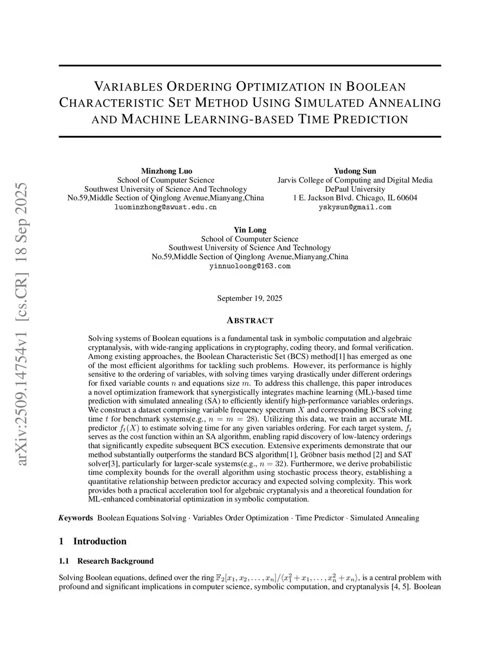 Solving systems of Boolean equations is a fundamental task in symbolic computation and algebraic cryptanalysis, with wide-ranging applications in cryptography, coding theory, and formal verification. Among existing approaches, the Boolean Characteristic Set (BCS) method[1] has emerged as one of the most efficient algorithms for tackling such problems. However, its performance is highly sensitive to the ordering of variables, with solving times varying drastically under different orderings for fixed variable counts n and equations size m. To address this challenge, this paper introduces a novel optimization framework that synergistically integrates machine learning (ML)-based time prediction with simulated annealing (SA) to efficiently identify high-performance variables orderings. Weconstruct a dataset comprising variable frequency spectrum X and corresponding BCS solving time t for benchmark systems(e.g., n = m = 28). Utilizing this data, we train an accurate ML predictor ft(X) to estimate solving time for any given variables ordering. For each target system, ft serves as the cost function within an SA algorithm, enabling rapid discovery of low-latency orderings that significantly expedite subsequent BCS execution. Extensive experiments demonstrate that our method substantially outperforms the standard BCS algorithm[1], Gröbner basis method [2] and SAT solver[3], particularly for larger-scale systems(e.g., n = 32). Furthermore, we derive probabilistic time complexity bounds for the overall algorithm using stochastic process theory, establishing a quantitative relationship between predictor accuracy and expected solving complexity. This work provides both a practical acceleration tool for algebraic cryptanalysis and a theoretical foundation for ML-enhanced combinatorial optimization in symbolic computation.