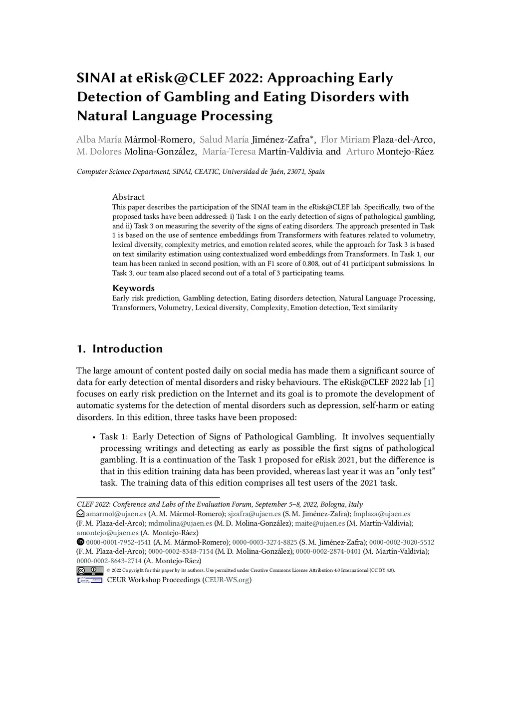 SINAI at eRisk@CLEF 2022: Approaching Early Detection of Gambling and Eating Disorders with Natural Language Processing