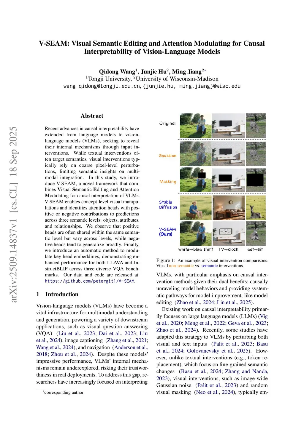 Recent advances in causal interpretability have extended from language models to vision-language models (VLMs), seeking to reveal their internal mechanisms through input interventions. While textual interventions often target semantics, visual interventions typically rely on coarse pixel-level perturbations, limiting semantic insights on multimodal integration. In this study, we introduce V-SEAM, a novel framework that combines Visual Semantic Editing and Attention Modulating for causal interpretation of VLMs. V-SEAM enables concept-level visual manipulations and identifies attention heads with positive or negative contributions to predictions across three semantic levels: objects, attributes, and relationships. We observe that positive heads are often shared within the same semantic level but vary across levels, while negative heads tend to generalize broadly. Finally, we introduce an automatic method to modulate key head embeddings, demonstrating enhanced performance for both LLaVA and InstructBLIP across three diverse VQA benchmarks. Our data and code are released at:this https URL.