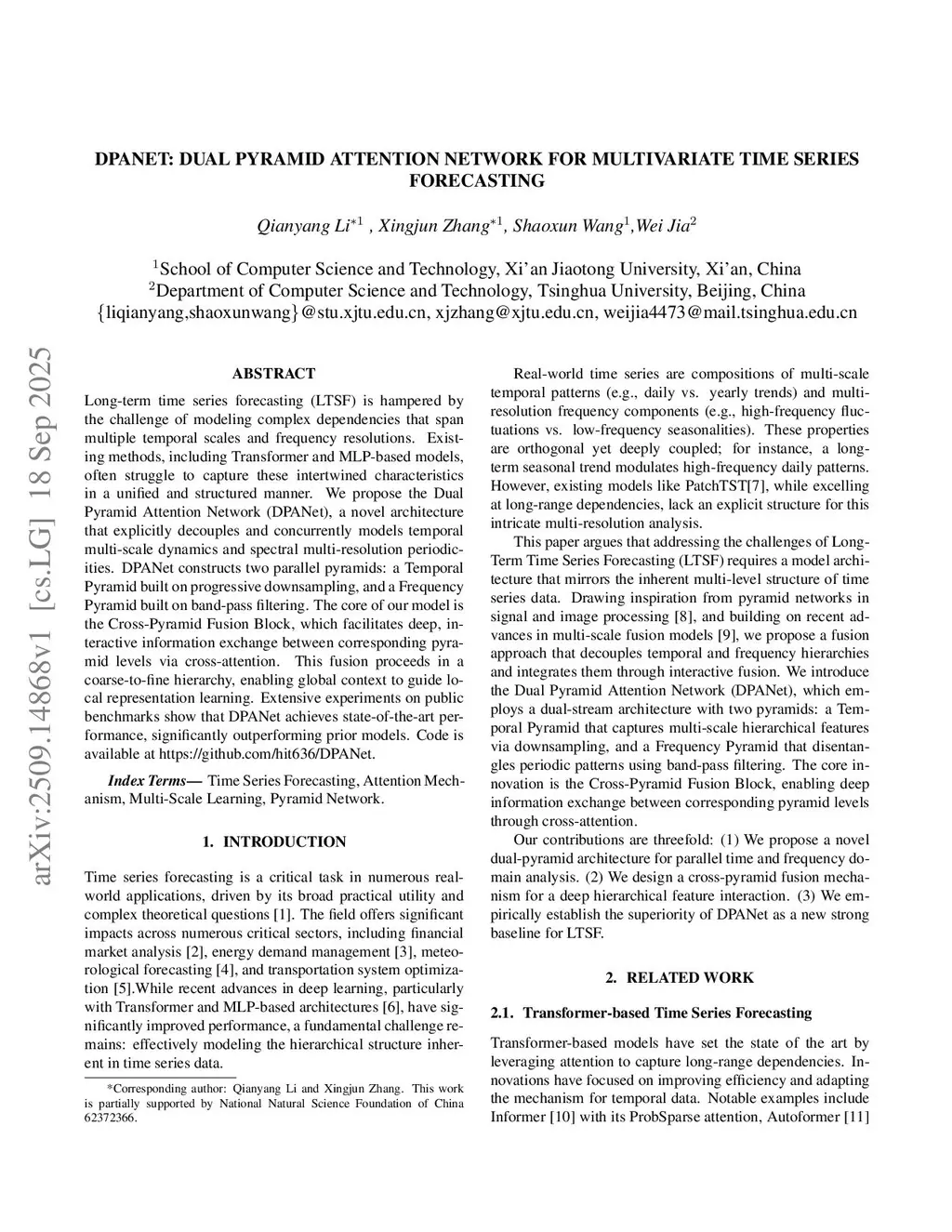 Long-term time series forecasting (LTSF) is hampered by the challenge of modeling complex dependencies that span multiple temporal scales and frequency resolutions. Existing methods, including Transformer and MLP-based models, often struggle to capture these intertwined characteristics in a unified and structured manner. We propose the Dual Pyramid Attention Network (DPANet), a novel architecture that explicitly decouples and concurrently models temporal multi-scale dynamics and spectral multi-resolution periodicities. DPANet constructs two parallel pyramids: a Temporal Pyramid built on progressive downsampling, and a Frequency Pyramid built on band-pass filtering. The core of our model is the Cross-Pyramid Fusion Block, which facilitates deep, interactive information exchange between corresponding pyramid levels via cross-attention. This fusion proceeds in a coarse-to-fine hierarchy, enabling global context to guide local representation learning. Extensive experiments on public benchmarks show that DPANet achieves state-of-the-art performance, significantly outperforming prior models. Code is available atthis https URL.