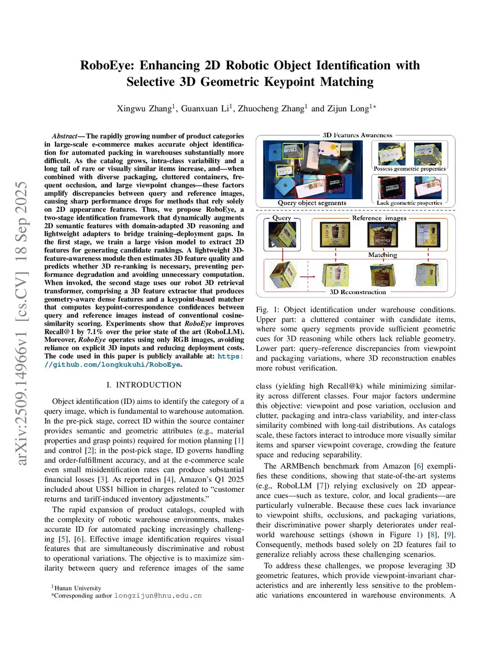 The rapidly growing number of product categories in large-scale e-commerce makes accurate object identification for automated packing in warehouses substantially more difficult. As the catalog grows, intra-class variability and a long tail of rare or visually similar items increase, and when combined with diverse packaging, cluttered containers, frequent occlusion, and large viewpoint changes-these factors amplify discrepancies between query and reference images, causing sharp performance drops for methods that rely solely on 2D appearance features. Thus, we propose RoboEye, a two-stage identification framework that dynamically augments 2D semantic features with domain-adapted 3D reasoning and lightweight adapters to bridge training deployment gaps. In the first stage, we train a large vision model to extract 2D features for generating candidate rankings. A lightweight 3D-feature-awareness module then estimates 3D feature quality and predicts whether 3D re-ranking is necessary, preventing performance degradation and avoiding unnecessary computation. When invoked, the second stage uses our robot 3D retrieval transformer, comprising a 3D feature extractor that produces geometry-aware dense features and a keypoint-based matcher that computes keypoint-correspondence confidences between query and reference images instead of conventional cosine-similarity scoring. Experiments show that RoboEye improves Recall@1 by 7.1% over the prior state of the art (RoboLLM). Moreover, RoboEye operates using only RGB images, avoiding reliance on explicit 3D inputs and reducing deployment costs. The code used in this paper is publicly available at:this https URL.