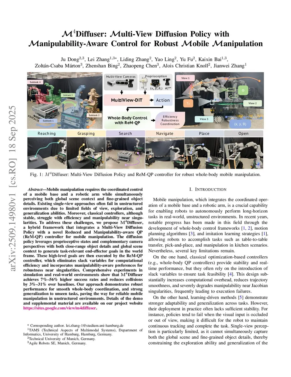 Mobile manipulation requires the coordinated control of a mobile base and a robotic arm while simultaneously perceiving both global scene context and fine-grained object details. Existing single-view approaches often fail in unstructured environments due to limited fields of view, exploration, and generalization abilities. Moreover, classical controllers, although stable, struggle with efficiency and manipulability near singularities. To address these challenges, we propose M4Diffuser, a hybrid framework that integrates a Multi-View Diffusion Policy with a novel Reduced and Manipulability-aware QP (ReM-QP) controller for mobile manipulation. The diffusion policy leverages proprioceptive states and complementary camera perspectives with both close-range object details and global scene context to generate task-relevant end-effector goals in the world frame. These high-level goals are then executed by the ReM-QP controller, which eliminates slack variables for computational efficiency and incorporates manipulability-aware preferences for robustness near singularities. Comprehensive experiments in simulation and real-world environments show that M4Diffuser achieves 7 to 56 percent higher success rates and reduces collisions by 3 to 31 percent over baselines. Our approach demonstrates robust performance for smooth whole-body coordination, and strong generalization to unseen tasks, paving the way for reliable mobile manipulation in unstructured environments. Details of the demo and supplemental material are available on our project websitethis https URL.