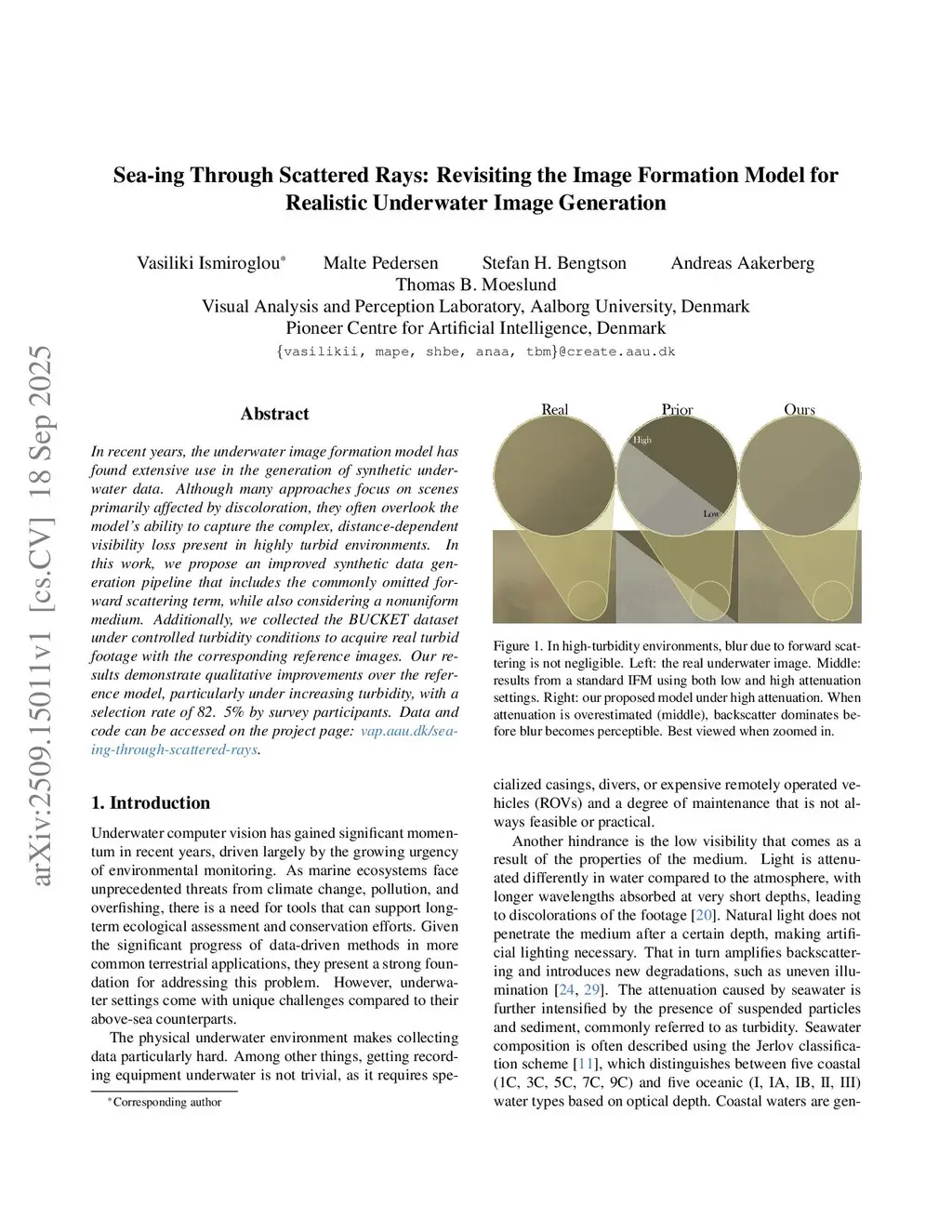 In recent years, the underwater image formation model has found extensive use in the generation of synthetic underwater data. Although many approaches focus on scenes primarily affected by discoloration, they often overlook the model's ability to capture the complex, distance-dependent visibility loss present in highly turbid environments. In this work, we propose an improved synthetic data generation pipeline that includes the commonly omitted forward scattering term, while also considering a nonuniform medium. Additionally, we collected the BUCKET dataset under controlled turbidity conditions to acquire real turbid footage with the corresponding reference images. Our results demonstrate qualitative improvements over the reference model, particularly under increasing turbidity, with a selection rate of 82.5% by survey participants. Data and code can be accessed on the project page:this http URL.