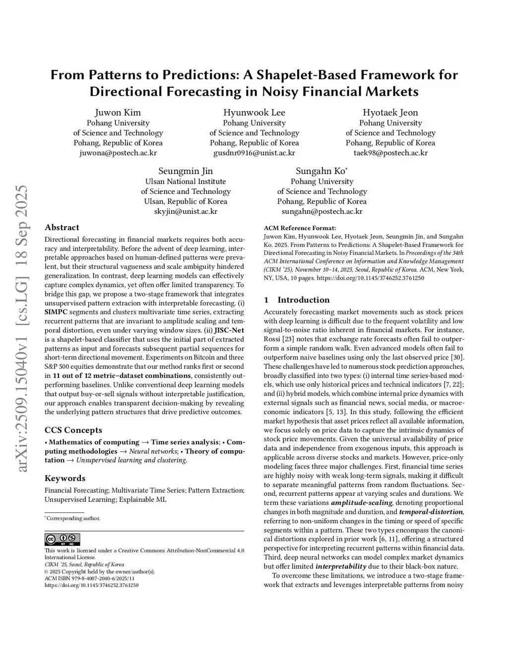 Directional forecasting in financial markets requires both accuracy and interpretability. Before the advent of deep learning, interpretable approaches based on human-defined patterns were prevalent, but their structural vagueness and scale ambiguity hindered generalization. In contrast, deep learning models can effectively capture complex dynamics, yet often offer limited transparency. To bridge this gap, we propose a two-stage framework that integrates unsupervised pattern extracion with interpretable forecasting. (i) SIMPC segments and clusters multivariate time series, extracting recurrent patterns that are invariant to amplitude scaling and temporal distortion, even under varying window sizes. (ii) JISC-Net is a shapelet-based classifier that uses the initial part of extracted patterns as input and forecasts subsequent partial sequences for short-term directional movement. Experiments on Bitcoin and three S&P 500 equities demonstrate that our method ranks first or second in 11 out of 12 metric--dataset combinations, consistently outperforming baselines. Unlike conventional deep learning models that output buy-or-sell signals without interpretable justification, our approach enables transparent decision-making by revealing the underlying pattern structures that drive predictive outcomes.