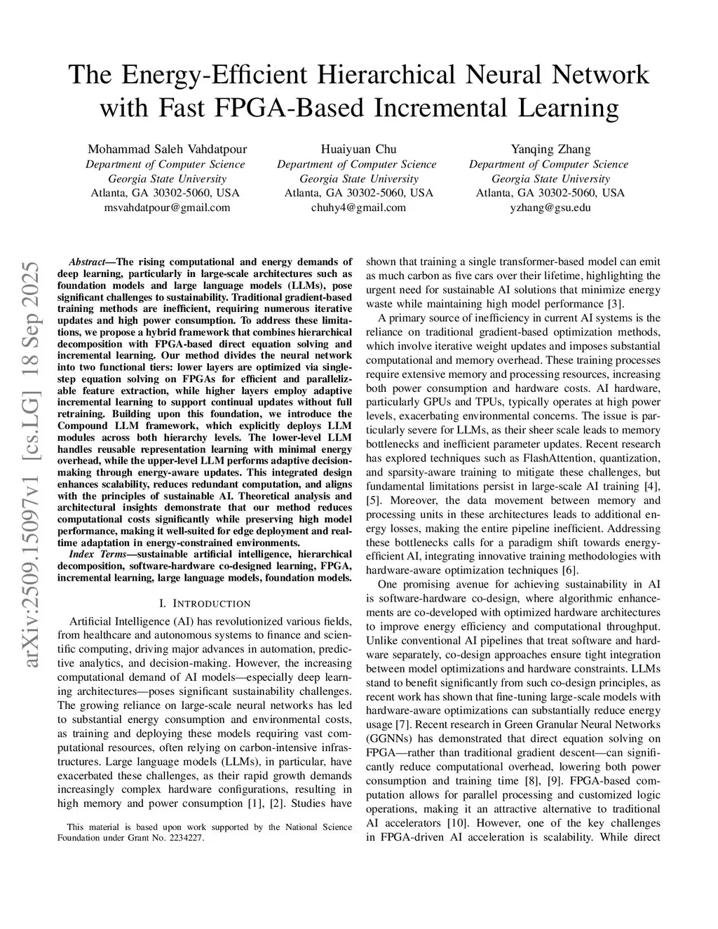 The rising computational and energy demands of deep learning, particularly in large-scale architectures such as foundation models and large language models (LLMs), pose significant challenges to sustainability. Traditional gradient-based training methods are inefficient, requiring numerous iterative updates and high power consumption. To address these limitations, we propose a hybrid framework that combines hierarchical decomposition with FPGA-based direct equation solving and incremental learning. Our method divides the neural network into two functional tiers: lower layers are optimized via single-step equation solving on FPGAs for efficient and parallelizable feature extraction, while higher layers employ adaptive incremental learning to support continual updates without full retraining. Building upon this foundation, we introduce the Compound LLM framework, which explicitly deploys LLM modules across both hierarchy levels. The lower-level LLM handles reusable representation learning with minimal energy overhead, while the upper-level LLM performs adaptive decision-making through energy-aware updates. This integrated design enhances scalability, reduces redundant computation, and aligns with the principles of sustainable AI. Theoretical analysis and architectural insights demonstrate that our method reduces computational costs significantly while preserving high model performance, making it well-suited for edge deployment and real-time adaptation in energy-constrained environments.