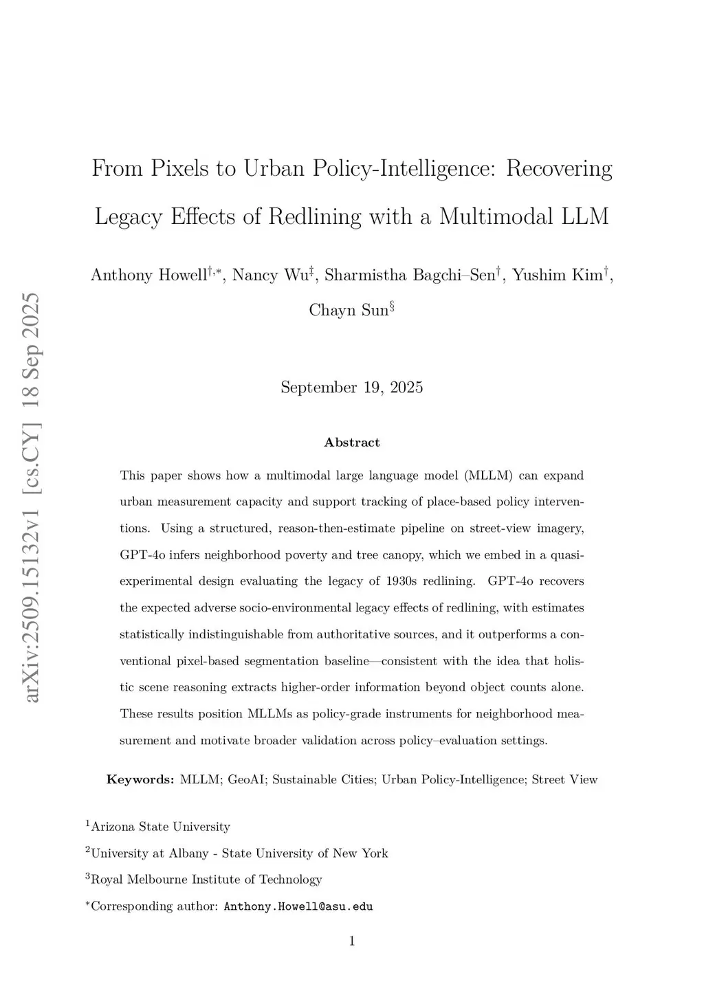 This paper shows how a multimodal large language model (MLLM) can expand urban measurement capacity and support tracking of place-based policy interventions. Using a structured, reason-then-estimate pipeline on street-view imagery, GPT-4o infers neighborhood poverty and tree canopy, which we embed in a quasi-experimental design evaluating the legacy of 1930s redlining. GPT-4o recovers the expected adverse socio-environmental legacy effects of redlining, with estimates statistically indistinguishable from authoritative sources, and it outperforms a conventional pixel-based segmentation baseline-consistent with the idea that holistic scene reasoning extracts higher-order information beyond object counts alone. These results position MLLMs as policy-grade instruments for neighborhood measurement and motivate broader validation across policy-evaluation settings.