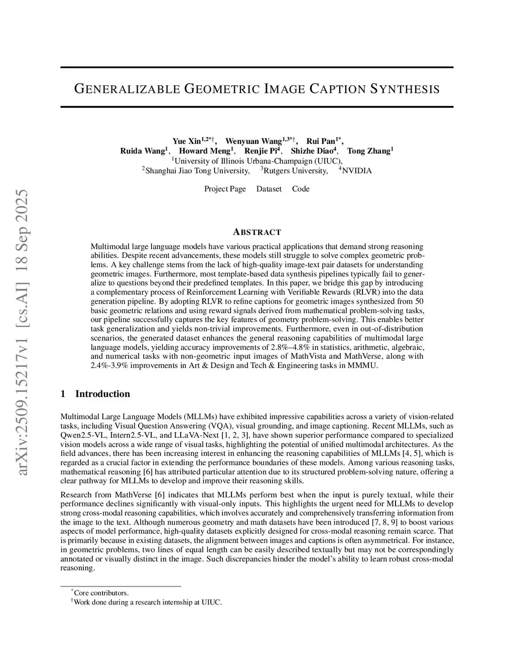 Multimodal large language models have various practical applications that demand strong reasoning abilities. Despite recent advancements, these models still struggle to solve complex geometric problems. A key challenge stems from the lack of high-quality image-text pair datasets for understanding geometric images. Furthermore, most template-based data synthesis pipelines typically fail to generalize to questions beyond their predefined templates. In this paper, we bridge this gap by introducing a complementary process of Reinforcement Learning with Verifiable Rewards (RLVR) into the data generation pipeline. By adopting RLVR to refine captions for geometric images synthesized from 50 basic geometric relations and using reward signals derived from mathematical problem-solving tasks, our pipeline successfully captures the key features of geometry problem-solving. This enables better task generalization and yields non-trivial improvements. Furthermore, even in out-of-distribution scenarios, the generated dataset enhances the general reasoning capabilities of multimodal large language models, yielding accuracy improvements of in statistics, arithmetic, algebraic, and numerical tasks with non-geometric input images of MathVista and MathVerse, along with improvements in Art, Design, Tech, and Engineering tasks in MMMU.
