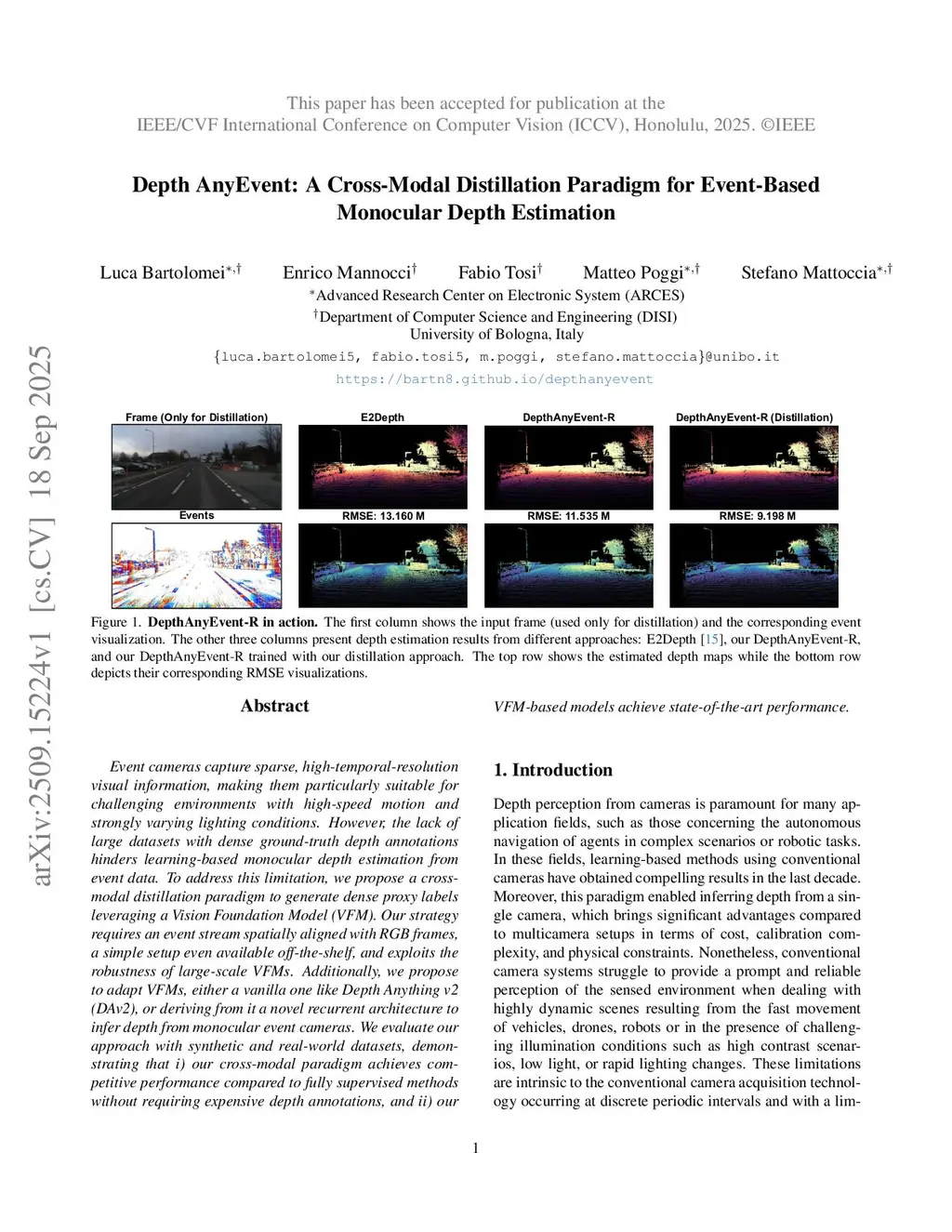Event cameras capture sparse, high-temporal-resolution visual information, making them particularly suitable for challenging environments with high-speed motion and strongly varying lighting conditions. However, the lack of large datasets with dense ground-truth depth annotations hinders learning-based monocular depth estimation from event data. To address this limitation, we propose a cross-modal distillation paradigm to generate dense proxy labels leveraging a Vision Foundation Model (VFM). Our strategy requires an event stream spatially aligned with RGB frames, a simple setup even available off-the-shelf, and exploits the robustness of large-scale VFMs. Additionally, we propose to adapt VFMs, either a vanilla one like Depth Anything v2 (DAv2), or deriving from it a novel recurrent architecture to infer depth from monocular event cameras. We evaluate our approach with synthetic and real-world datasets, demonstrating that i) our cross-modal paradigm achieves competitive performance compared to fully supervised methods without requiring expensive depth annotations, and ii) our VFM-based models achieve state-of-the-art performance.