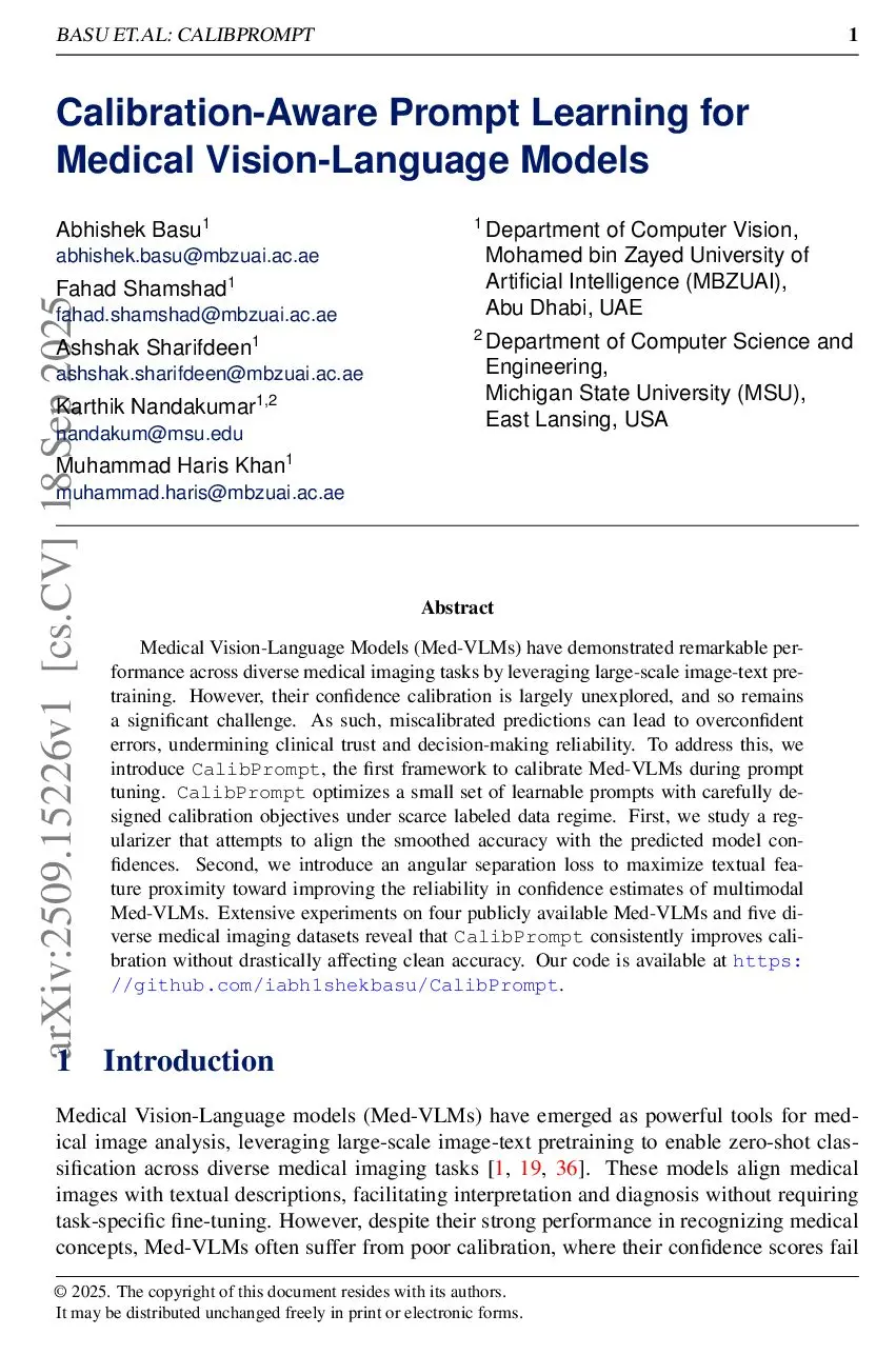 Medical Vision-Language Models (Med-VLMs) have demonstrated remarkable performance across diverse medical imaging tasks by leveraging large-scale image-text pretraining. However, their confidence calibration is largely unexplored, and so remains a significant challenge. As such, miscalibrated predictions can lead to overconfident errors, undermining clinical trust and decision-making reliability. To address this, we introduce CalibPrompt, the first framework to calibrate Med-VLMs during prompt tuning. CalibPrompt optimizes a small set of learnable prompts with carefully designed calibration objectives under scarce labeled data regime. First, we study a regularizer that attempts to align the smoothed accuracy with the predicted model confidences. Second, we introduce an angular separation loss to maximize textual feature proximity toward improving the reliability in confidence estimates of multimodal Med-VLMs. Extensive experiments on four publicly available Med-VLMs and five diverse medical imaging datasets reveal that CalibPrompt consistently improves calibration without drastically affecting clean accuracy. Our code is available atthis https URL.