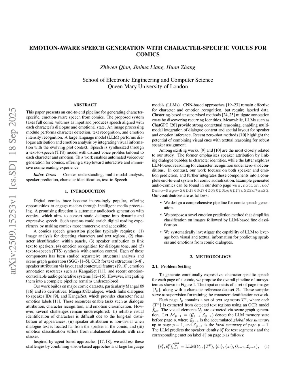 This paper presents an end-to-end pipeline for generating character-specific, emotion-aware speech from comics. The proposed system takes full comic volumes as input and produces speech aligned with each character's dialogue and emotional state. An image processing module performs character detection, text recognition, and emotion intensity recognition. A large language model performs dialogue attribution and emotion analysis by integrating visual information with the evolving plot context. Speech is synthesized through a text-to-speech model with distinct voice profiles tailored to each character and emotion. This work enables automated voiceover generation for comics, offering a step toward interactive and immersive comic reading experience.