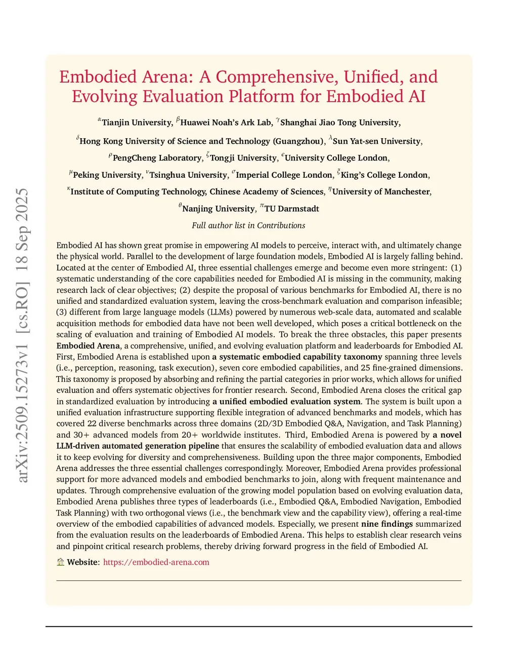 Embodied AI development significantly lags behind large foundation models due to three critical challenges: (1) lack of systematic understanding of core capabilities needed for Embodied AI, making research lack clear objectives; (2) absence of unified and standardized evaluation systems, rendering cross-benchmark evaluation infeasible; and (3) underdeveloped automated and scalable acquisition methods for embodied data, creating critical bottlenecks for model scaling. To address these obstacles, we present Embodied Arena, a comprehensive, unified, and evolving evaluation platform for Embodied AI. Our platform establishes a systematic embodied capability taxonomy spanning three levels (perception, reasoning, task execution), seven core capabilities, and 25 fine-grained dimensions, enabling unified evaluation with systematic research objectives. We introduce a standardized evaluation system built upon unified infrastructure supporting flexible integration of 22 diverse benchmarks across three domains (2D/3D Embodied Q&A, Navigation, Task Planning) and 30+ advanced models from 20+ worldwide institutes. Additionally, we develop a novel LLM-driven automated generation pipeline ensuring scalable embodied evaluation data with continuous evolution for diversity and comprehensiveness. Embodied Arena publishes three real-time leaderboards (Embodied Q&A, Navigation, Task Planning) with dual perspectives (benchmark view and capability view), providing comprehensive overviews of advanced model capabilities. Especially, we present nine findings summarized from the evaluation results on the leaderboards of Embodied Arena. This helps to establish clear research veins and pinpoint critical research problems, thereby driving forward progress in the field of Embodied AI.